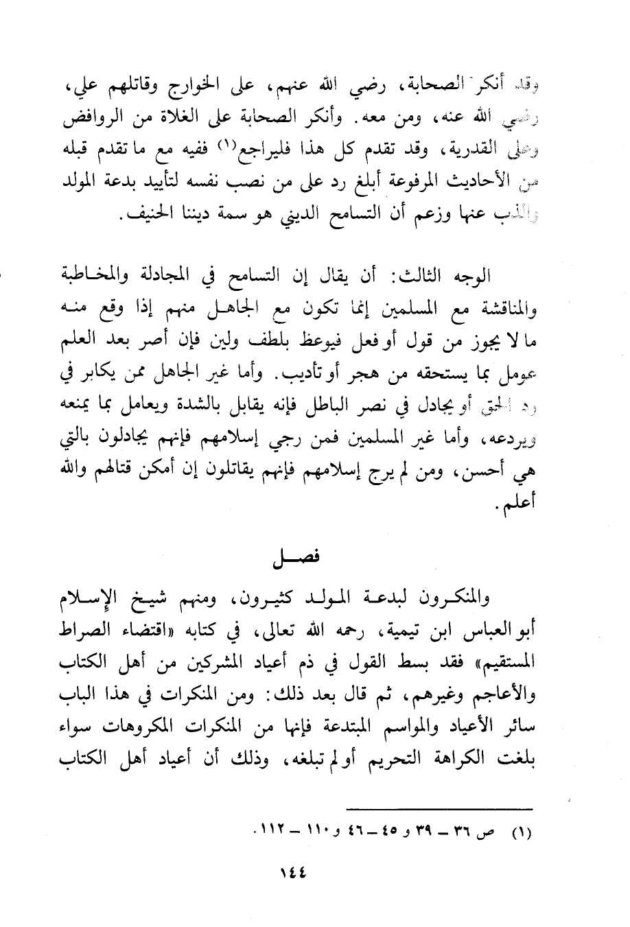 وقد أنكر الصحابة رضي الله عنهم على الخوارج وقاتلهم علي رضي الله عنه ومن معه، وأنكر الصحابة على الغلاة من الروافض وعلى القدرية، وقد تقدم كل هذا فليراجع (¬1) ففيه مع ما تقدم قبله من الأحاديث المرفوعة أبلغ رد على من نصب نفسه لتأييد بدعة المولد والذب عنها وزعم أن التسامح الديني هو سمة ديننا الحنيف.