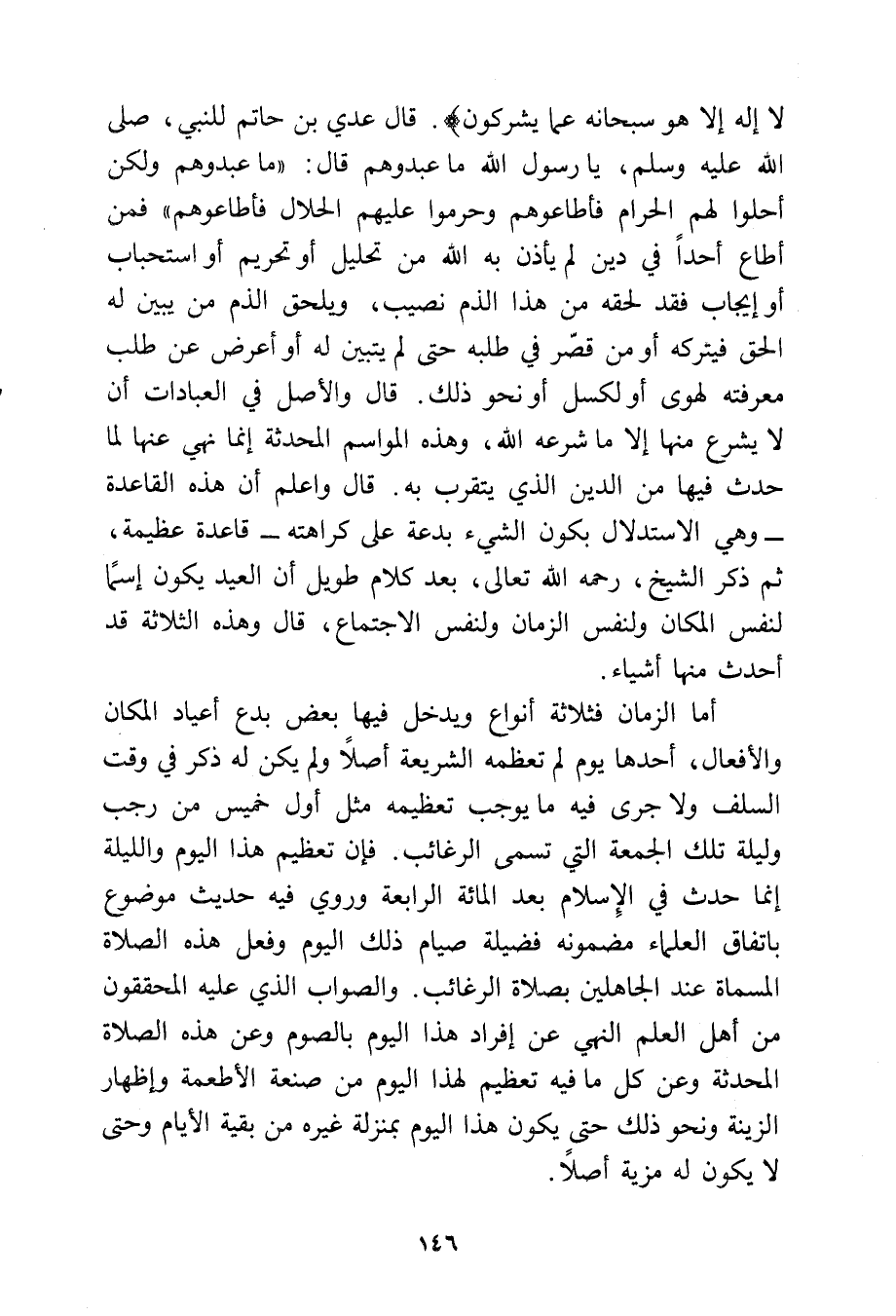 لَا إِلَهَ إِلَّا هُوَ سُبْحَانَهُ عَمَّا يُشْرِكُونَ} قال عدي بن حاتم للنبي - صلى الله عليه وسلم - يا رسول الله ما عبدوهم قال: «ما عبدوهم ولكن أحلوا لهم الحرام فأطاعوهم وحرموا عليهم الحلال فأطاعوهم» فمن أطاع أحدًا في دين لم يأذن به الله من تحليل أو تحريم أو استحباب أو إيجاب فقد