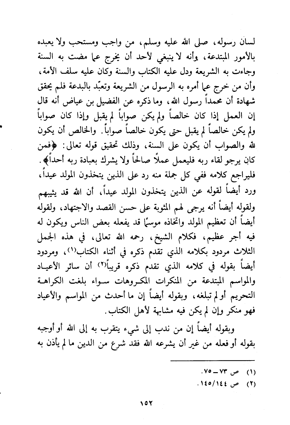 لسان رسوله - صلى الله عليه وسلم - من واجب ومستحب، ولا يعبده بالأمور المبتدعة، وأنه لا ينبغي لأحد أن يخرج عما مضت به السنة وجاءت به الشريعة ودل عليه الكتاب والسنة وكان عليه سلف الأمة، وأن من خرج عما أمره به الرسول من الشريعة وتعبد بالبدعة فلم يحقق شهادة أن محمدًا رسول الله، وما ذكره عن الفضيل بن عياض أنه قال: إن العمل إذا كان خالصًا ولم يكن صوابًا لم يقبل، وإذ كان صوابًا ولم يكن خالصًا لم يقبل حتى يكون خالصًا صوابًا. والخالص: أن يكون لله، والصواب أن يكون على السنة وذلك تحقيق قوله تعالى: {فَمَنْ كَانَ يَرْجُوا لِقَاءَ رَبِّهِ فَلْيَعْمَلْ عَمَلاً صَالِحًا وَلَا يُشْرِكْ بِعِبَادَةِ رَبِّهِ أَحَدًا} فليراجع كلامه ففي كل جملة منه رد على الذين يتخذون المولد عيدًا، ورد أيضًا لقوله عن الذين يتخذون المولد عيدًا أن الله قد يثيبهم ولقوله أيضًا أنه يرجى لهم المثوبة على حسن القصد والاجتهاد ولقوله أيضًا أن تعظيم المولد واتخاذه موسمًا قد يفعله بعض الناس ويكون له فيه أجر عظيم فكلام الشيخ رحمه الله تعالى في هذه الجمل الثلاث مردود بكلامه الذي تقدم ذكره في أثناء الكتاب (¬1) ومردود أيضًا بقوله في كلامه الذي تقدم ذكره قريبًا (¬2) أن سائر الأعياد والمواسم المبتدعة من المنكرات المكروهات سواء بلغت الكراهة التحريم أو لم تبلغه، وبقوله أيضًا: إن ما أحدث من المواسم والأعياد فهو منكر وإن لم يكن فيه مشابهة لأهل الكتاب.