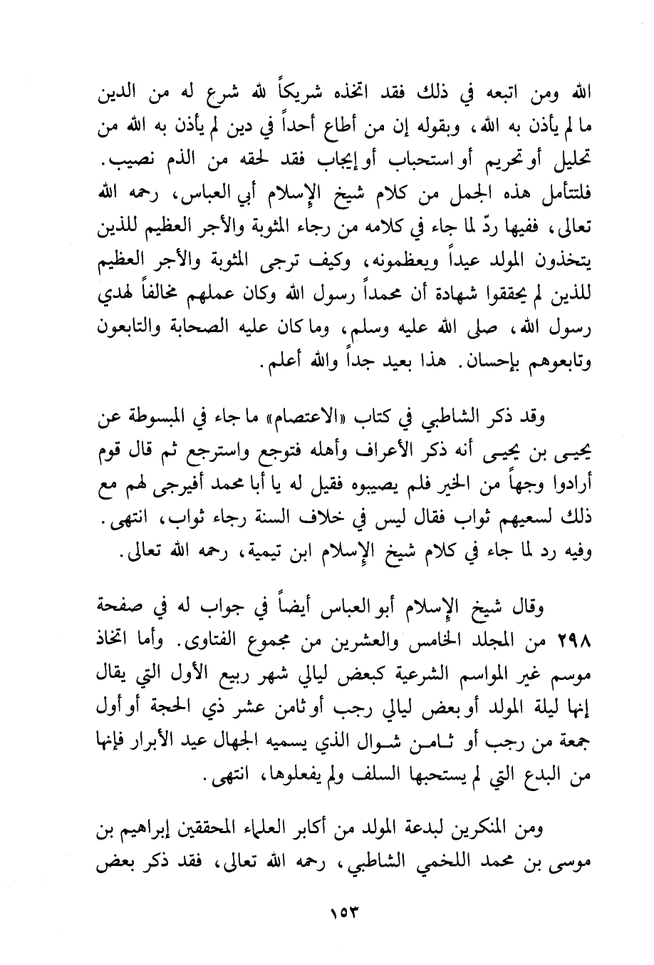 الله، ومن اتبعه في ذلك فقد اتخذه شريكًا لله شرع له من الدين ما لم يأذن به الله، وبقوله إن من أطاع أحدًا في دين لم يأذن به الله من تحليل أو تحريم أو استحباب أو إيجاب فقد لحقه من الذم نصيب، فلتتأمل هذه الجمل من كلام شيخ الإسلام أبي العباس، رحمه الله تعالى ففيها رد لما جاء في كلامه من رجاء المثوبة والأجر العظيم للذين يخذون المولد عيدًا ويعظمونه وكيف ترجى المثوبة والأجر العظيم للذين لم يحققوا شهادة أن محمدًا رسول الله وكان عملهم مخالفًا لهدي رسول الله - صلى الله عليه وسلم - وما كان عليه الصحابة والتابعون وتابعوهم بإحسان هذا بعيد جدًا والله أعلم.