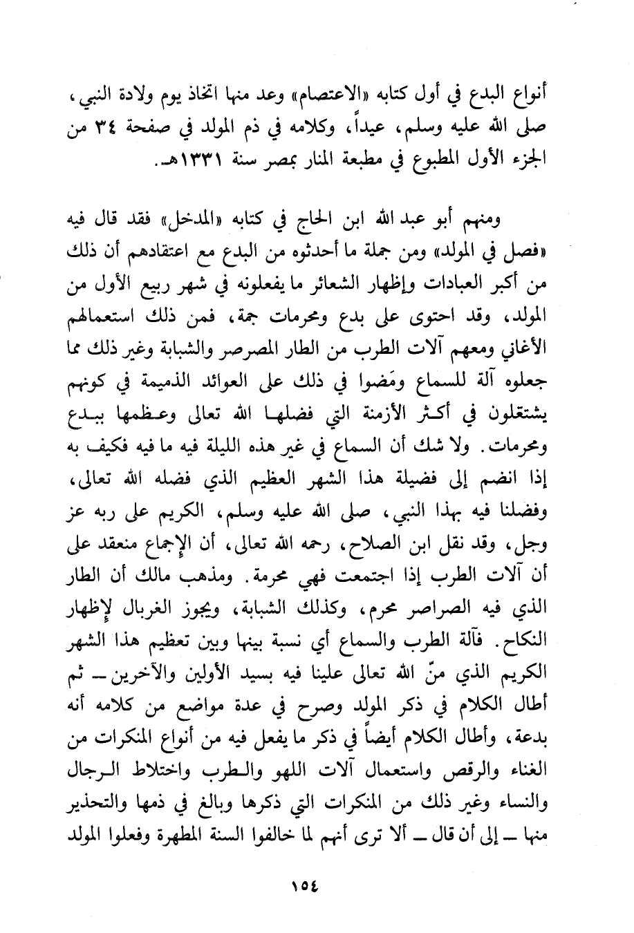 ومنهم أبو عبد الله ابن الحاج في كتابه «المدخل» فقد قال فيه «فصل في المولد» ومن جملة ما أحدثوه من البدع مع اعتقادهم أن ذلك من أكبر العبادات وإظهار الشعائر ما يفعلونه في شهر ربيع الأول من المولد، وقد احتوى على بدع ومحرمات جمة، فمن ذلك استعمالهم الأغاني ومعهم آلات الطرب من الطار المصرصر والشبابة وغير ذلك مما جعلوه آلة للسماع، ومضوا في ذلك على العوائد الذميمة في كونهم يشتغلون في أكثر الأزمنة التي فضلها الله تعالى وعظمها ببدع ومحرمات ولا شك أن السماع في غير هذه الليلة فيه ما فيه فكيف به إذا انضم إلى فضيلة هذا الشهر العظيم الذي فضله الله تعالى وفضلنا فيه بهذا النبي - صلى الله عليه وسلم - الكريم على ربه عز وجل وقد نقل ابن الصلاح رحمه الله تعالى أن الإجماع منعقد على أن آلات الطرب إذا اجتمعت فهي محرمة، ومذهب مالك أن الطار الذي فيه الصراصر محرم، وكذلك الشبابة، ويجوز الغربال لإظهار النكاح فآلة الطرب والسماع أي نسبة بينها وبني تعظيم هذا الشهر الكريم الذي من الله تعالى علينا فيه بسيد الأولين والآخرين، ثم أطال الكلام في ذكر المولد وصرح في عدة مواضع من كلامه أنه بدعة وأطال الكلام أيضًا في ذكر ما يفعل فيه من أنواع المنكرات من الغناء والرقص واستعمال آلات اللهو والطرب واختلاط الرجال والنساء وغير ذلك من المنكرات التي ذكرها وبالغ في ذمها والتحذير منها إلى أن قال: ألا ترى أنهم لما خالفوا السنة المطهرة وفعلوا المولد