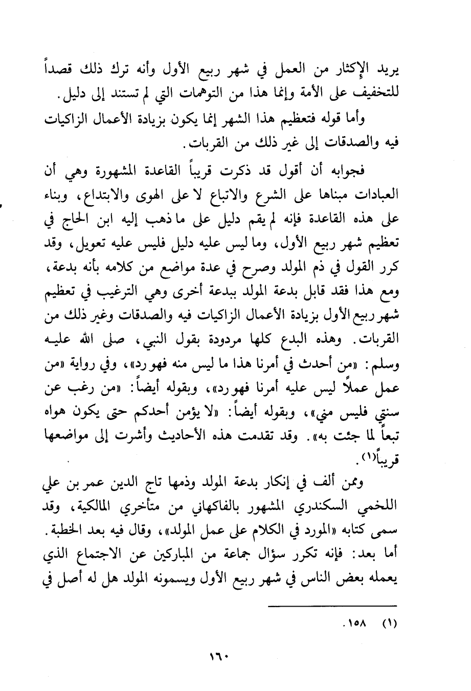 فجوابه أن أقول قد ذكرت قريبًا القاعدة المشهورة: وهي أن العبادات مبناها على الشرع والاتباع لا على الهوى والابتداع، وبناء على هذه القاعدة فإنه لم يقم دليل على ما ذهب إليه ابن لحاج في تعظيم شهر ربيع الأول، وما ليس عليه دليل فليس عليه تعويل، وقد كرر القول في ذم المولد وصرح في عدة مواضع من كلامه بأنه بدعة ومع هذا فقد قابل بدعة المولد ببدعة أخرى وهي الترغيب في تعظيم شهر ربيع الأول بزيادة الأعمال الزاكيات فيه والصدقات وغير ذلك من القربات، وهذه البدع كلها مردودة بقول النبي - صلى الله عليه وسلم -: «من أحدث في أمرنا هذا ما ليس منه فهو رد» وفي رواية «من عمل عملا ليس عليه أمرنا فهو رد» وبقوله أيضًا: «من رغب عن سنتي فليس مني» وبقوله أيضًا: «لا يؤمن أحدكم حتى يكون هواه تبعًا لما جئت به» وقد تقدمت هذه الأحاديث وأشرت إلى مواضعها قريبًا.