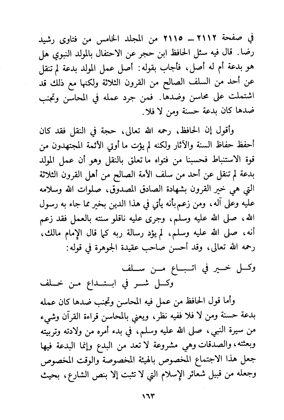 وأقول إن الحافظ رحمه الله تعالى حجة في النقل فقد كان أحفظ حفاظ السنة والآثار ولكنه لم يؤت ما أوتي الأئمة المجتهدون من قوة الاستنباط فحسبنا من فتواه ما تعلق بالنقل وهو أن عمل المولد بدعة لم تنقل عن أحد من سلف الأمة الصالح من أهل القرون الثلاثة التي هي خير القرون بشهادة الصادق المصدوق صلوات الله وسلامه عليه وعلى آله، ومن زعم بأنه يأتي في هذا الدين بخير مما جاء به رسول الله - صلى الله عليه وسلم - وجرى عليه ناقلو سنته بالعمل فقد زعم أنه - صلى الله عليه وسلم - لم يؤد رسالة ربه كما قال الإمام مالك رحمه الله تعالى وقد أحسن صاحب عقيدة الجوهرة في قوله.