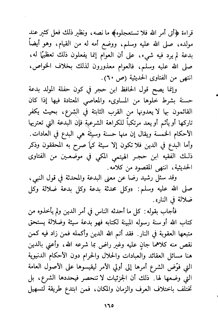 وإنما يصح قول الحافظ ابن حجر في كون حفلة المولد بدعة حسنة بشرط خلوها من المساوئ والمعاصي المعتادة فيها إذا كان القائمون بها لا يعدونها من القرب الثابتة في الشرع بحيث يكفر تاركها أو يأثم أو يعد مرتكبًا للكراهة الشرعية، فإن البدعة التي تعتريها الأحكام الخمسة ويقال إن منها حسنة وسيئة هي البدع في العادات، وأما البدع في الدين فلا تكون إلا سيئة كما صرح به المحققون وذكر ذلك الفقيه ابن حجر الهيتمي المكي في موضعين من الفتاوى الحديثية، انتهى المقصود من كلامه.