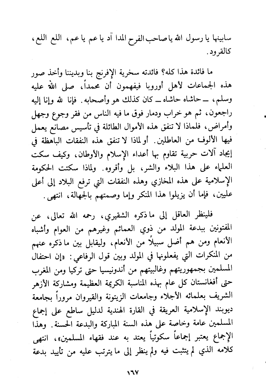 ما فائدة هذا كله؟ فائدته سخرية الإفرنج بنا وبديننا وأخذ صور هذه الجماعات لأهل أوروبا فيفهمون أن محمدًا - صلى الله عليه وسلم - حاشاه حاشه كان كذلك هو وأصحابه فإنا لله وإنا إليه راجعون، ثم هو خراب ودمار فوق ما فيه الناس من فقر وجوع وجهل وأمراض فلماذا لا تنفق هذه الأموال الطائلة في تأسيس مصانع يعمل فيها الألوف من العاطلين. أو لماذا لا تنفق هذه النفقات الباهظة في إيجاد آلات حربية تقاوم بها أعداء الإسلام والأوطان وكيف سكت العلماء على هذا البلاء والشر، بل وأقروه، ولماذا سكتت الحكومة الإسلامية على هذه المخازي وهذه النفقات التي ترفع البلاد إلى أعلى عليين، فإما أن يزيلوا هذا المنكر وإما وصمتهم بالجهالة انتهى.