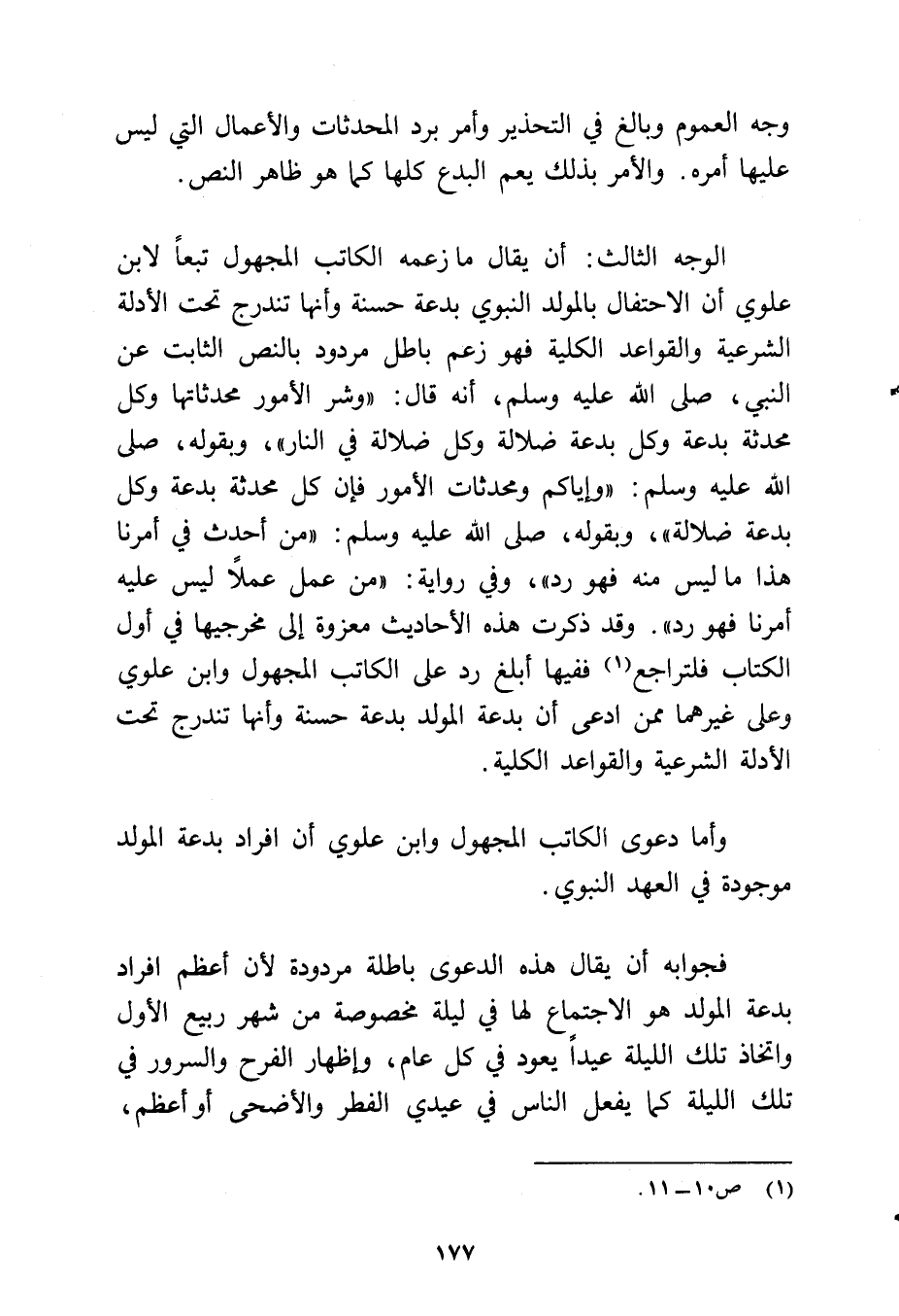 الوجه الثالث: أن يُقال ما زعمه الكاتب المجهول تبعًا لابن علوي أن الاحتفال بالمولد النبوي بدعة حسنة وأنها تندرج تحت الأدلة الشرعية والقواعد الكلية فهو زعم باطل مردود بالنص الثابت عن النبي - صلى الله عليه وسلم - أنه قال: «وشر الأمور محدثاتها وكل محدثة بدعة وكل بدعة ضلالة وكل ضلالة في النار» وبقوله - صلى الله عليه وسلم - «وإياكم ومحدثات الأمور فإن كل محدثة بدعة وكل بدعة ضلالة» وبقوله - صلى الله عليه وسلم -: «من أحدث في أمرنا هذا ما ليس منه فهو رد» وفي رواية: «من عمل عملاً ليس عليه أمرنا فهو رد» وقد ذكرت هذه الأحاديث معزوة إلى مخرجيها في أول الكتاب فلتراجع (¬1) ففيها أبلغ رد على الكاتب المجهول وابن علوي وعلى غيرهما ممن ادعى أن بدعة المولد بدعة حسنة وأنها تندرج تحت الأدلة الشرعية والقواعد الكلية.