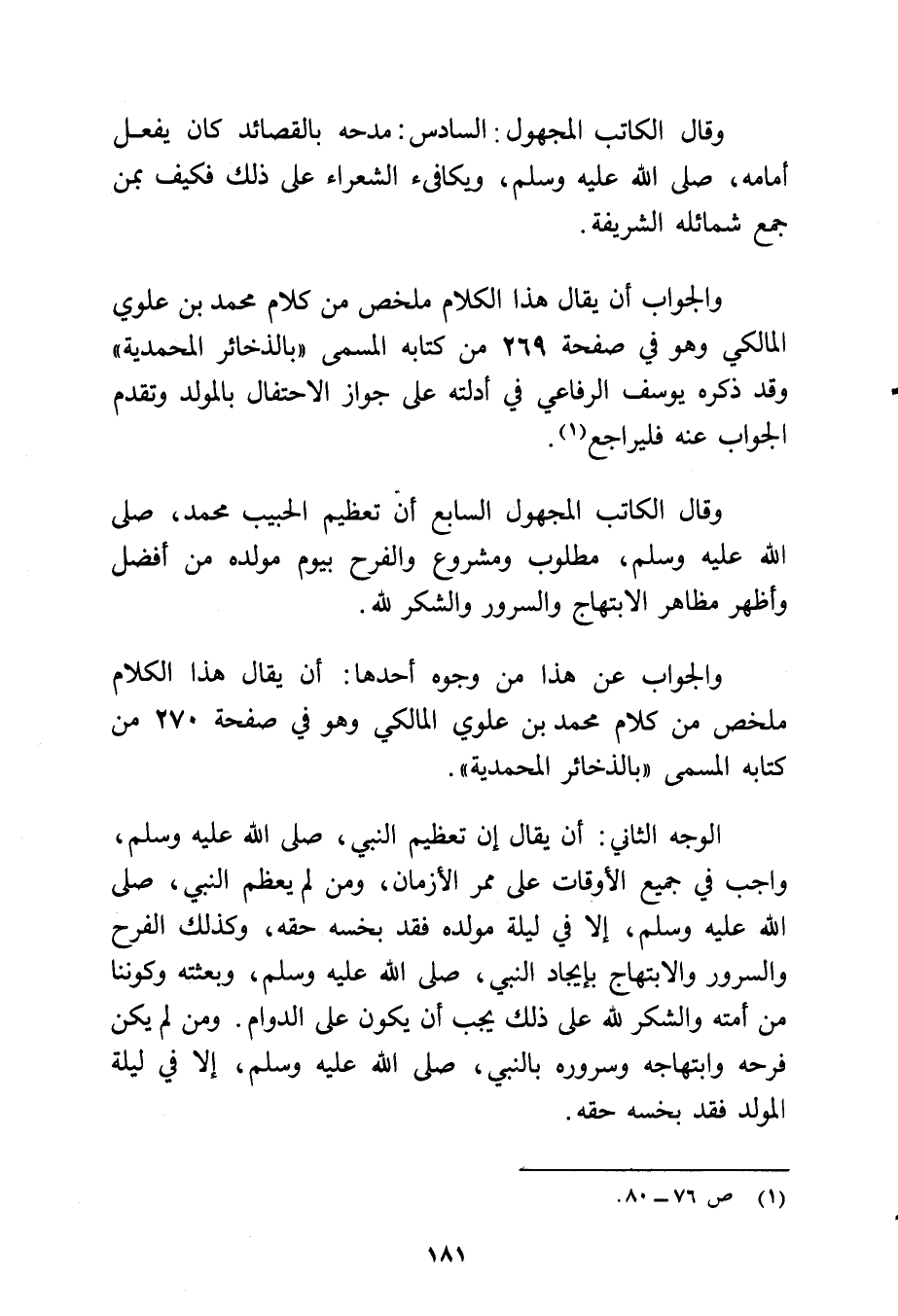 والجواب أن يُقال هذا الكلام ملخص من كلام محمد بن علوي المالكي وهو في ص269 من كتابه المسمى "بالذخائر المحمدية" وقد ذكره يوسف الرفاعي في أدلته على جواز الاحتفال بالمولد وتقدم الجواب عنه فليراجع (¬1).