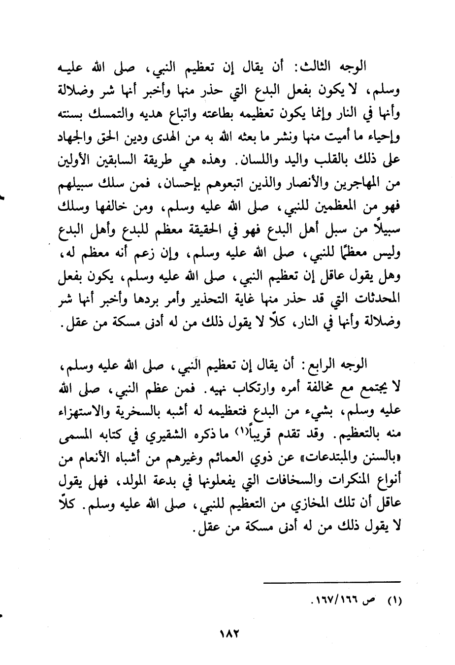 الوجه الثالث: أن يُقال إن تعظيم النبي - صلى الله عليه وسلم - لا يكون بفعل البدع التي حذر منها وأخبر أنها شر وضلالة وأنها في النار، وإنما يكون تعظيمه بطاعته واتباع هديه والتمسك بسنته وإحياء ما أميت منها ونشر ما بعثه الله به من الهدى ودين الحق والجهاد على ذلك بالقلب واليد واللسان، وهذه هي طريقة السابقين الأولين من المهاجرين والأنصار والذين اتبعوهم بإحسان فمن سلك سبيلهم فهو من المعظمين للنبي - صلى الله عليه وسلم - ومن خالفها وسلك سبيلاً من سبل أهل البدع فهو في الحقيقة معظم للبدع وأهل البدع وليس معظمًا للنبي - صلى الله عليه وسلم -، وإن زعم أنه معظم له وهل يقول عاقل إن تعظيم النبي - صلى الله عليه وسلم - يكون بفعل المحدثات التي قد حذر منها غاية التحذير؟ وأمر بردها وأخبر أنها شر وضلالة وأنها في النار، كلا لا يقول ذلك من له أدنى مسكة من عقل.