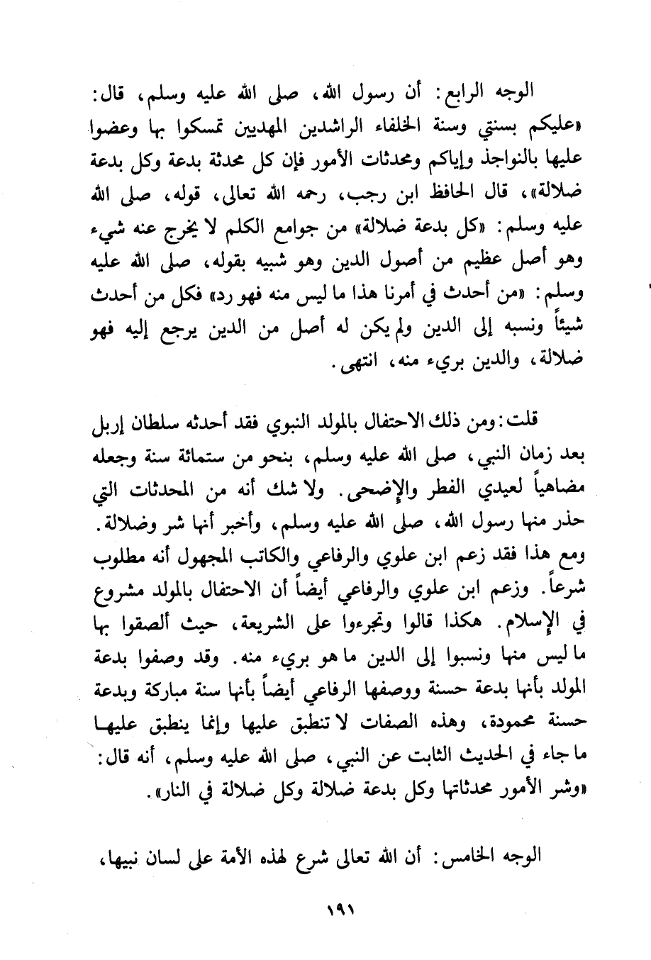 الوجه الرابع: أن رسول الله - صلى الله عليه وسلم - قال: «عليكم بسنتي وسنة الخلفاء الراشدين المهديين تمسكوا بها وعضوا عليها بالنواجذ وإياكم ومحدثات الأمور فإن كل محدثة بدعة وكل بدعة ضلالة».