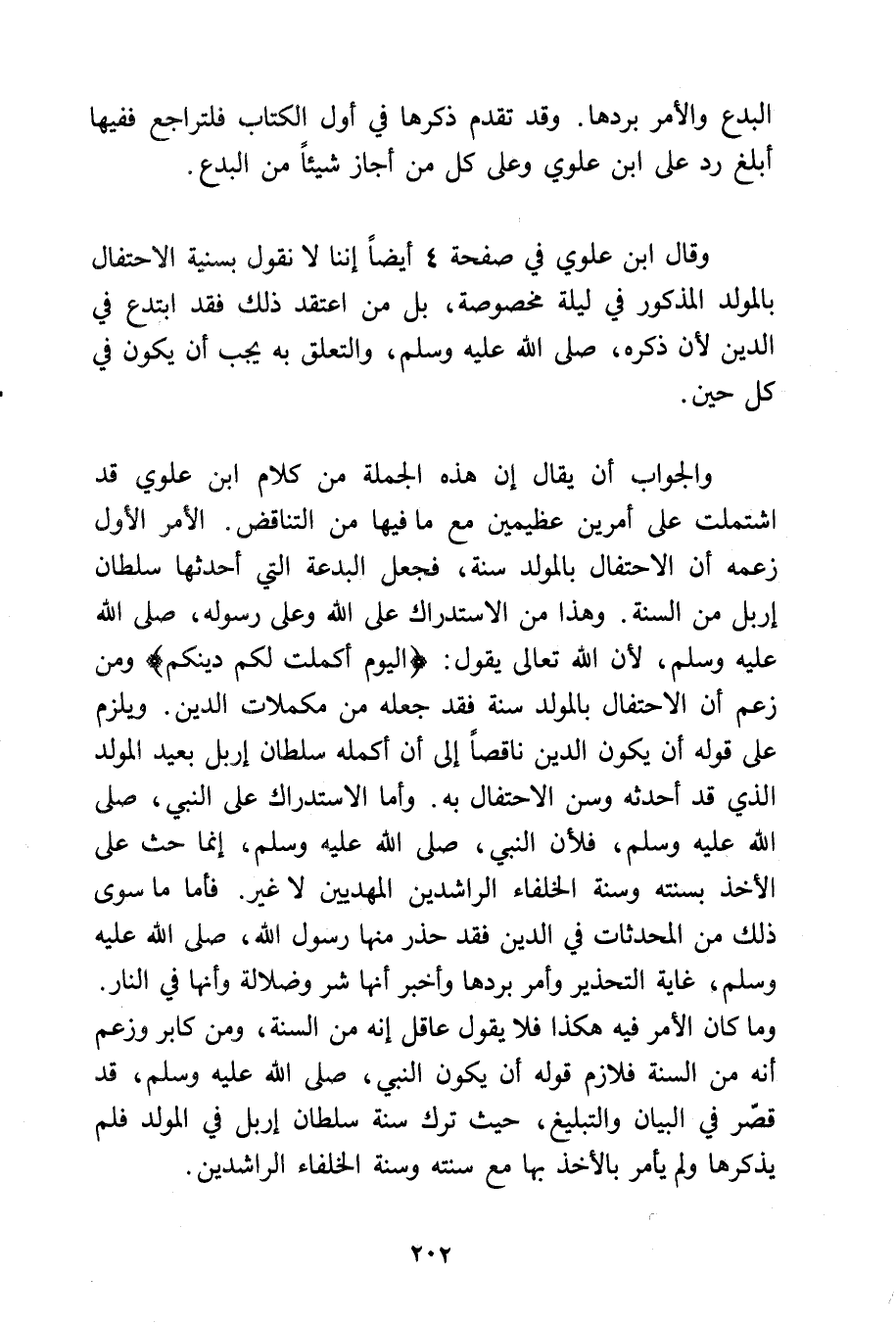 والجواب أن يقال إن هذه الجملة من كلام ابن علوي قد اشتملت على أمرين عظيمين مع ما فيها من التناقض الأمر الأول: زعمه أن الاحتفال بالمولد سنة، فجعل البدعة التي أحدثها سلطان إربل من السنة وهذا من الاستدراك على الله وعلى رسوله - صلى الله عليه وسلم - لن الله تعالى يقول {الْيَوْمَ أَكْمَلْتُ لَكُمْ دِينَكُمْ} ومن زعم أن الاحتفال بالمولد سنة فقد جعله من مكملات الدين ويلزم على قوله أن يكون الدين ناقصًا إلى أكمله سلطان إربل بعيد المولد الذي قد أحدثه وسن الاحتفال به وما الاستدراك على النبي - صلى الله عليه وسلم - فلأن النبي - صلى الله عليه وسلم - إنما حث على الأخذ بسنته وسنة الخلفاء الراشدين المهديين لا غير فما ما سوى ذلك من المحدثات في لدين فقد حذر منها رسول الله - صلى الله عليه وسلم - غاية التحذير وأمر بردها وأخبر أنها شر وضلالة وأنها في النار، وما كان الأمر فيه هكذا فلا يقول عاقل إنه من السنة، ومن كابر وزعم أنه من السنة فلازم قوله أن يكون النبي - صلى الله عليه وسلم - قد قصر في البيان والتبليغ حيث ترك سنة سلطان إربل في المولد فلم يذكرها ولم يأمر بالأخذ بها مع سنته وسنة الخلفاء الراشدين.