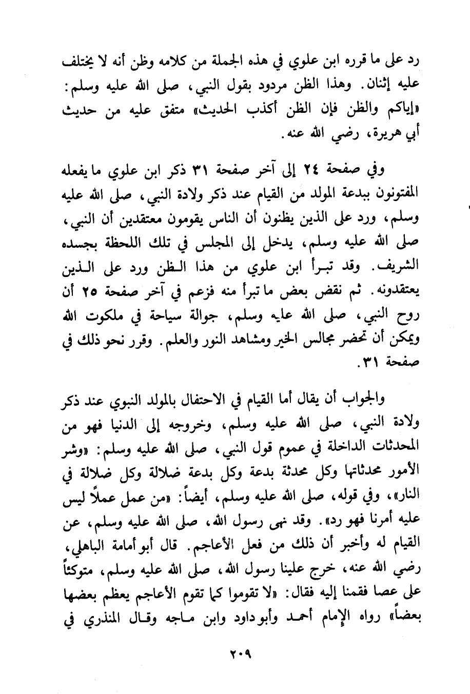 وفي ص (24) إلى آخر ص (31) ذكر ابن علوي ما يفعله المفتونون ببدعة المولد من القيام عند ذكر ولادة النبي - صلى الله عليه وسلم - ورد على الذين يظنون أن الناس يقومون معتقدين أن النبي - صلى الله عليه وسلم - يدخل إلى المجلس في تلك اللحظة بجسده الشريف، وقد تبرأ ابن علوي من هذا الظن ورد على الذين يعتقدونه ثم نقض بعض ما تبرأ منه فزعم في آخر ص (25) أن روح النبي - صلى الله عليه وسلم - جوالة سياحة في ملكوت الله ويمكن أن تحضر مجالس الخير ومشاهد النور والعلم وقرر نحو ذلك في ص (31).
