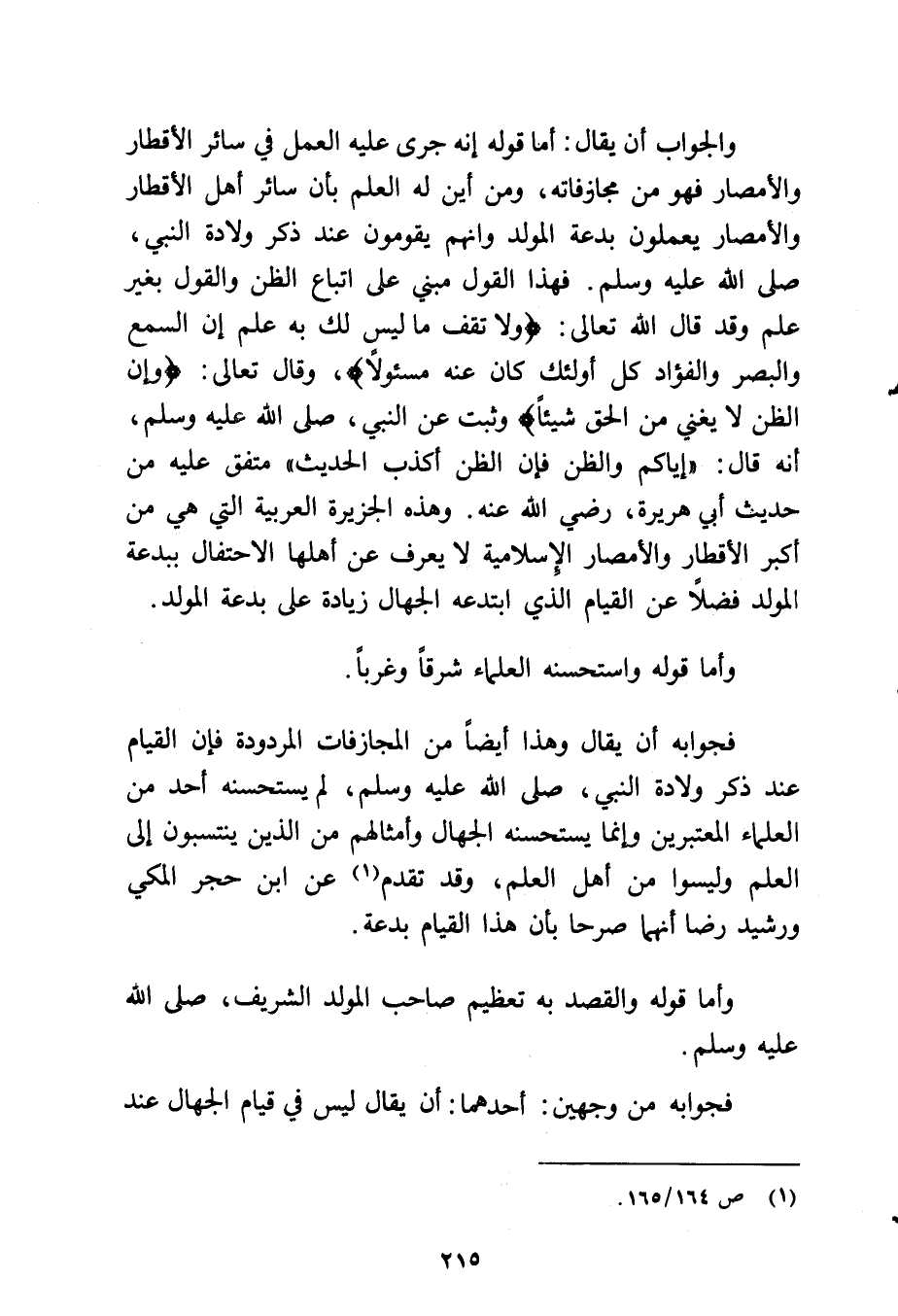 والجواب أن يقال: أما قوله إنه جرى عليه العمل في سائر الأقطار والأمصار فهو من مجازفاته ومن أين له العلم بأن سائر أهل الأقطار والأمصار يعملون بدعة المولد وإنهم يقومون عند ذكر ولادة النبي - صلى الله عليه وسلم - فهذا القول مبني على اتباع الظن والقول بغير علم وقد قال الله تعالى: {وَلَا تَقْفُ مَا لَيْسَ لَكَ بِهِ عِلْمٌ إِنَّ السَّمْعَ وَالْبَصَرَ وَالْفُؤَادَ كُلُّ أُولَئِكَ كَانَ عَنْهُ مَسْئُولاً} وقال تعالى: {وَإِنَّ الظَّنَّ لَا يُغْنِي مِنَ الْحَقِّ شَيْئًا} وثبت عن النبي - صلى الله عليه وسلم - أنه قال: «إياكم والظن فإن الظن أكذب الحديث» متفق عليه من حديث أبي هريرة رضي الله عنه، وهذه الجزيرة العربية التي هي من أكبر الأقطار والأمصار الإسلامية لا يعرف عن أهلها الاحتفال ببدعة المولد فضلاً عن القيام الذي ابتدعه الجهال زيادة على بدعة المولد.