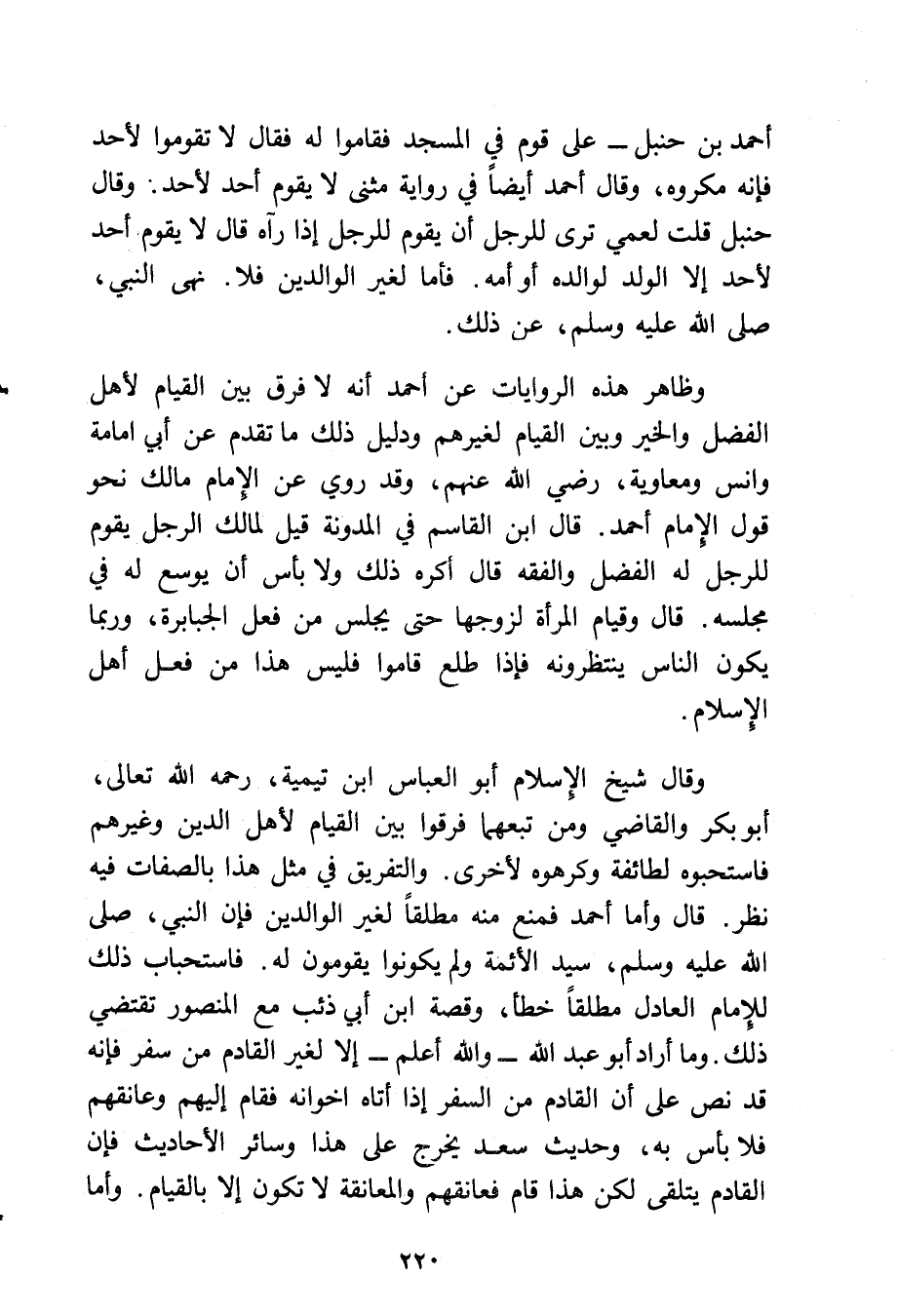 وقال شيخ الإسلام أبو العباس ابن تيمية رحمه الله تعالى: أبو بكر والقاضي ومن تبعهما فرقوا بين القيام لأهل الدين وغيرهم فاستحبوا لطائفة وكرهوه لأخرى والتفريق في مثل هذا بالصفات فيه نظر قال وأما أحمد فمنع منه مطلقًا لغير الوالدين فإن النبي - صلى الله عليه وسلم - سيد الأئمة ولم يكونوا يقومون له فاستحباب ذلك للإمام العادل مطلقًا خطأ وقصة ابن أبي ذئب مع المنصور تقتضي ذلك، وما أراد أبو عبد الله والله أعلم إلا لغير القادم من سفر فإنه قد نص على أن القادم من السفر إذا أتاه إخوانه فقام إليهم وعانقهم فلا بأس به، وحديث سعد يخرج على هذا وسائر الأحاديث فإن القادم يتلقى لكن هذا قام فعانقهم والمعانقة لا تكون إلا بالقيام وأما