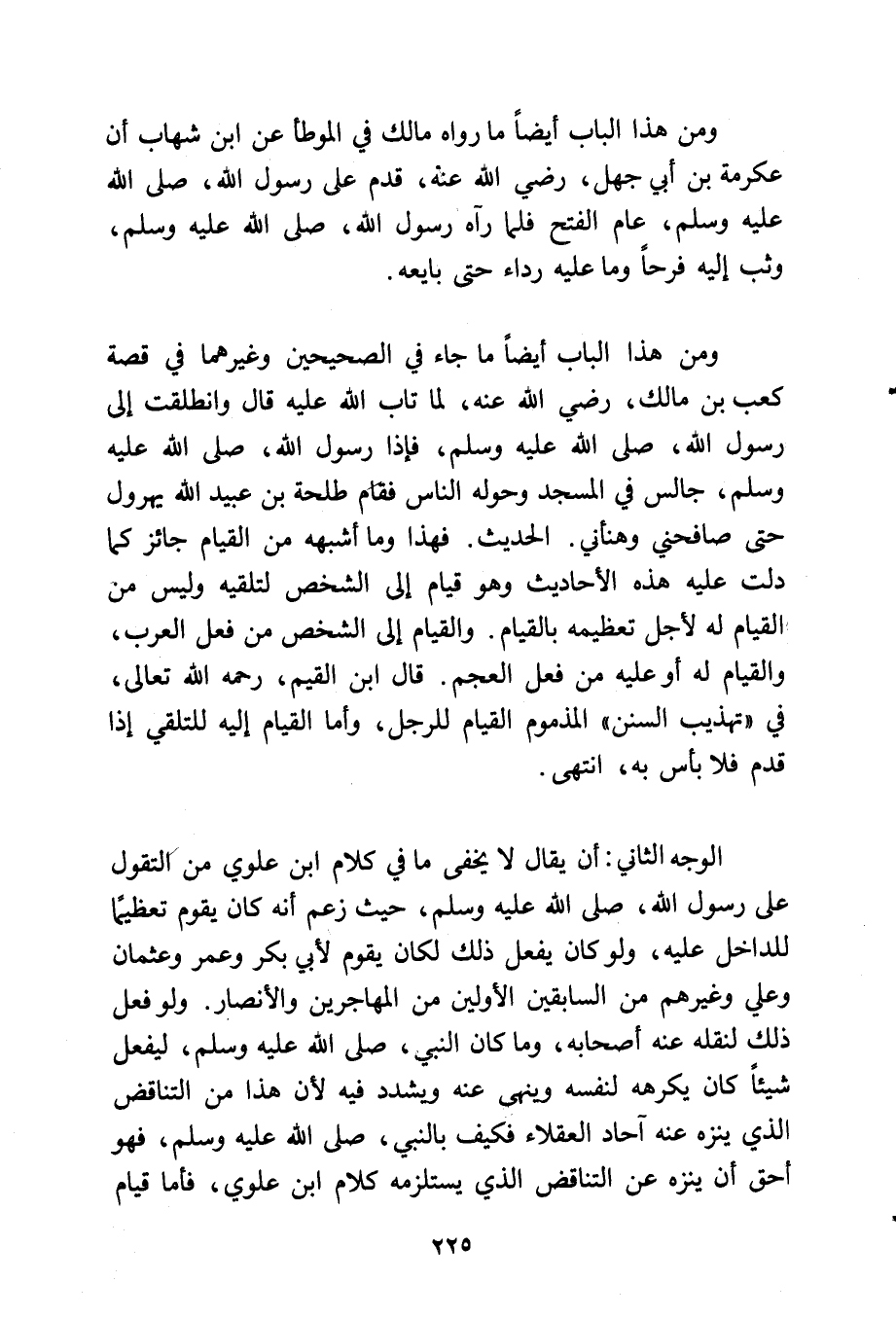 الوجه الثاني: أن يقال لا يخفى ما في كلام ابن علوي من التقول على رسول الله - صلى الله عليه وسلم - حيث زعم أنه كان يقوم تعظيما للداخل عليه ولو كان يفعل ذلك لكان يقوم لأبي بكر وعمر وعثمان وعلي وغيرهم من السابقين الأولين من المهاجرين والأنصار، ولو فعل ذلك لنقله عنه أصحابه، وما كان النبي - صلى الله عليه وسلم - ليفعل شيئًا كان يكرهه لنفسه وينهى عنه ويشدد فيه؛ لأن هذا من التناقض الذي ينزه عنه آحاد العقلاء فيكف بالنبي - صلى الله عليه وسلم - فهو أحق أن ينزه عن التناقض الذي يستلزمه كلام ابن علوي، فأما قيام