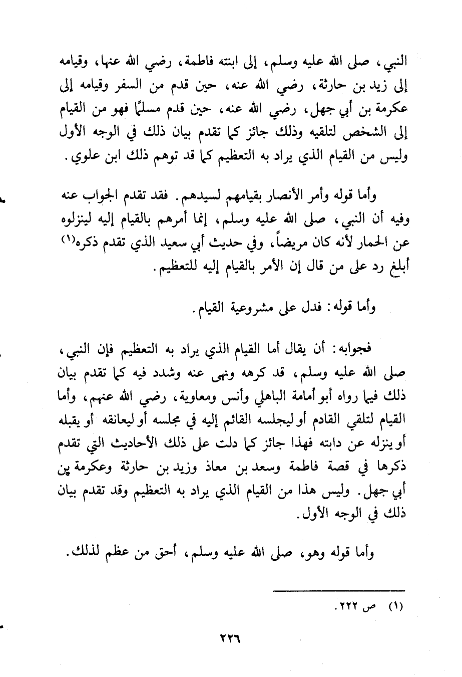 النبي - صلى الله عليه وسلم - إلى ابنته فاطمة رضي الله عنها وقيامه إلى زيد بن حارثة رضي الله عنه حين قدم من السفر وقيامه إلى عكرمة بن أبي جهل رضي الله عنه حين قدم مسلمًا فهو من القيام إلى الشخص لتلقيه وذلك جائز كما تقدم بيان ذلك في الوجه الأول وليس من القيام الذي يراد به التعظيم كما قد توهم ذلك ابن علوي.