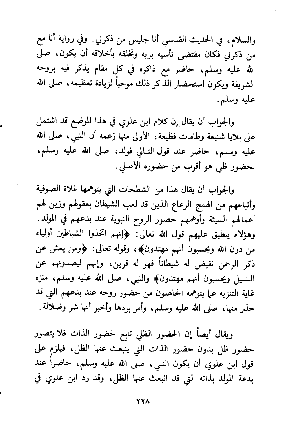 والجواب أن يقال: إن كلام ابن علوي في هذا الموضع قد اشتمل على بلايا شنيعة وطامات فظيعة الأولى منها زعمه أن النبي - صلى الله عليه وسلم - حاضر عند قول التالي فولد - صلى الله عليه وسلم - بحضور ظلي هو أقرب من حضوره الأصلي.