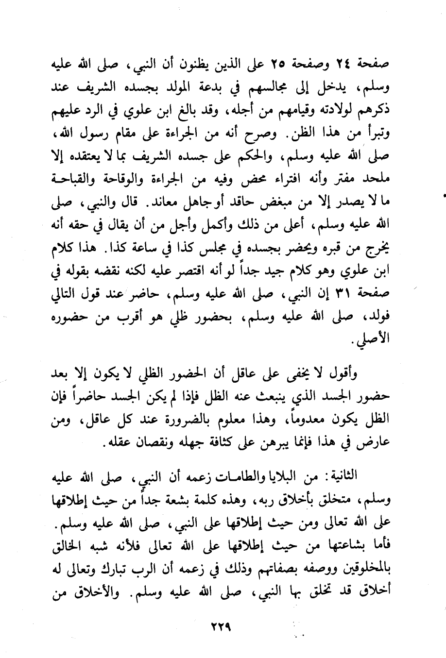 ص (24)، وص (25) على الذين يظنون أن النبي - صلى الله عليه وسلم - يدخل إلى مجالسهم في بدعة المولد بجسده الشريف عند ذكرهم لولادته وقيامهم من أجله، وقد بالغ ابن علوي في الرد عليهم وتبرأ من هذا الظن، وصرح أنه من الجراءة على مقام رسول الله - صلى الله عليه وسلم - والحكم على جسده الشريف بما لا يعتقده إلا ملحد مفتر وأنه افتراء محض وفيه من الجراءة والوقاحة والقباحة ما لا يصدر إلا من مبغض حاقد أو جاهل معاند. قال والنبي - صلى الله عليه وسلم - أعلى من ذلك وأكمل وأجل من أن يقال في حقه أنه يخرج من قبره ويحضر بجسده في مجلس كذا في ساعة كذا، هذا كلام ابن علوي وهو كلام جيد جدًا لو أنه اقتصر عليه لكنه نقضه بقوله في ص (31) إن النبي - صلى الله عليه وسلم - حاضر عند قول التالي فولد - صلى الله عليه وسلم - بحضور ظلي هو أقرب من حضوره الأصلي.