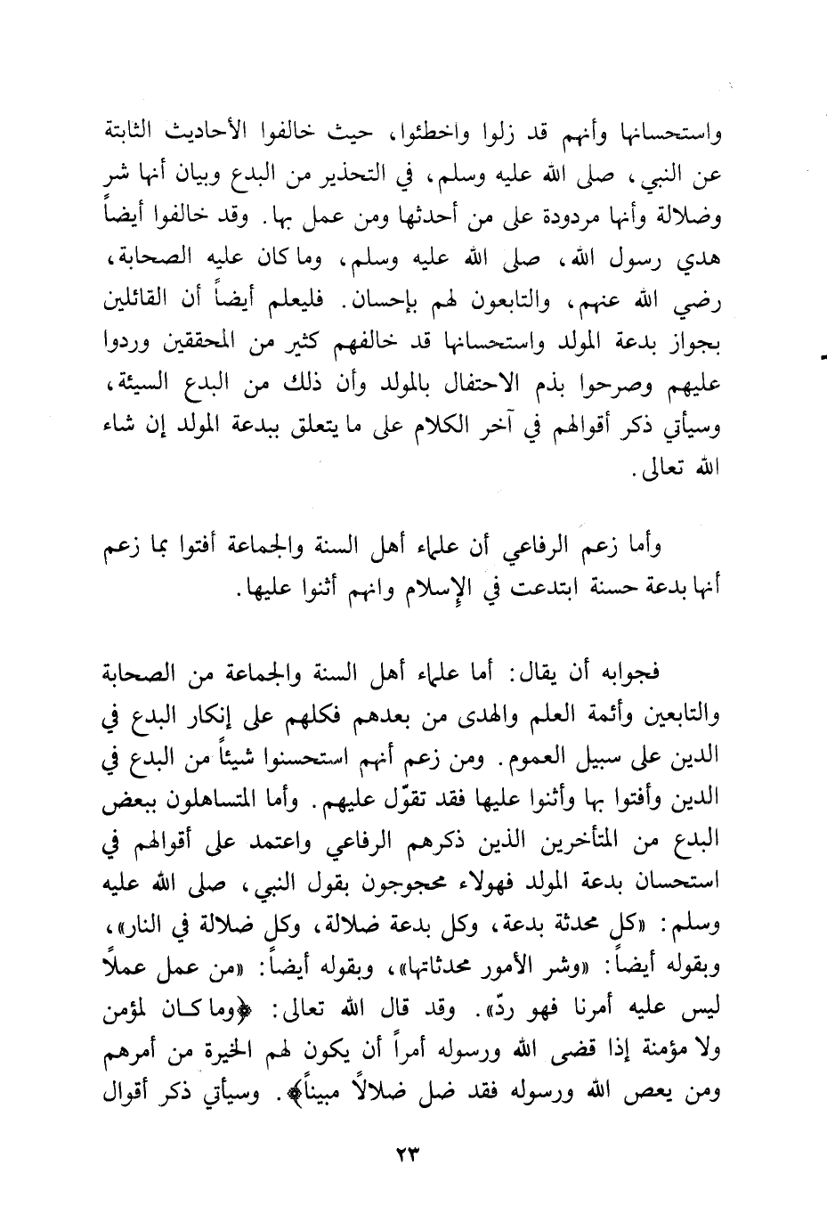 فجوابه أن يقال: أما علماء أهل السنة والجماعة من الصحابة والتابعين وأئمة العلم والهدي من بعدهم، فكلهم على إنكار البدع في الدين على سبيل العموم. ومن زعم أنهم استحسنوا شيئًا من البدع في الدين وأفتوا بها وأثنوا عليها فقد تقول عليهم. وأما المتساهلون ببعض البدع من المتأخرين الذين ذكرهم الرفاعي واعتمد على أقوالهم في استحسان بدعة المولد، فهؤلاء محجوجون بقول النبي - صلى الله عليه وسلم -: «كل محدثة بدعة، وكل بدعة ضلالة، وكل ضلالة في النار»، وبقوله أيضًا: «وشر الأمور محدثاتها»، وبقوله أيضًا: «من عمل عملا ليس عليه أمرنا فهو رد»، وقد قال الله تعالى: {وَمَا كَانَ لِمُؤْمِنٍ وَلَا مُؤْمِنَةٍ إِذَا قَضَى اللَّهُ وَرَسُولُهُ أَمْرًا أَنْ يَكُونَ لَهُمُ الْخِيَرَةُ مِنْ أَمْرِهِمْ وَمَنْ يَعْصِ اللَّهَ وَرَسُولَهُ فَقَدْ ضَلَّ ضَلَالاً مُبِينًا}، وسيأتي ذكر أقوال