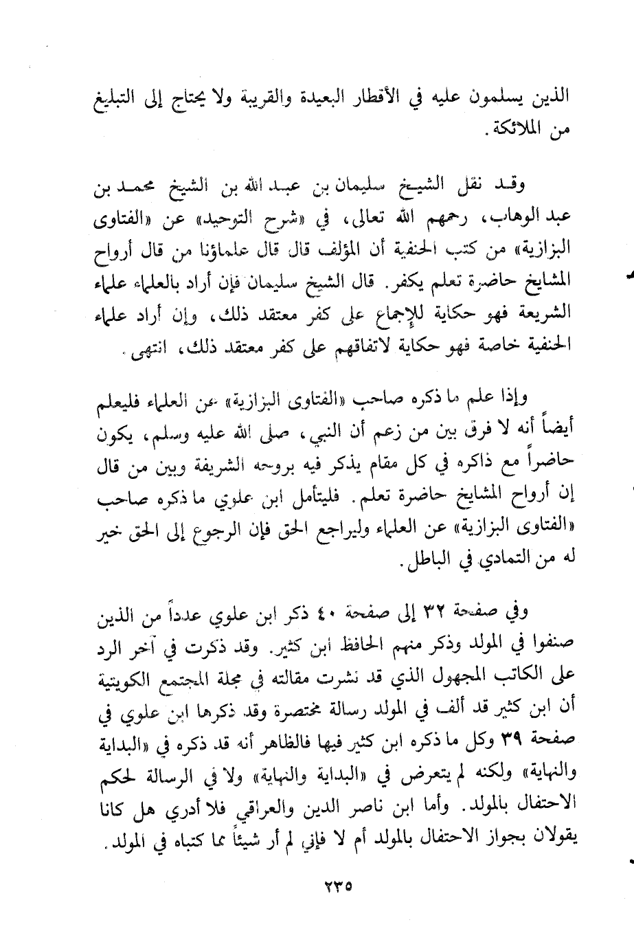 وفي ص (32) إلى ص (40) ذكر ابن علوي عددًا من الذين صنفوا في المولد وذكر منهم الحافظ ابن كثير، وقد ذكرت في آخر الرد على الكاتب المجهول الذي قد نشرت مقالته في مجلة المجتمع الكويتية أن ابن كثير قد ألف في المولد رسالة مختصرة وقد ذكرها ابن علوي في ص (39) وكل ما ذكره ابن كثير فيها فالظاهر أنه قد ذكره في "البداية والنهاية" ولكنه لم يتعرض في "البداية والنهاية" ولا في الرسالة لحكم الاحتفال بالمولد. وأما ابن ناصر الدين والعراقي فلا أدري هل كانا يقولان بجواز الاحتفال بالمولد أم لا فإني لم أر شيئًا مما كتباه في المولد.