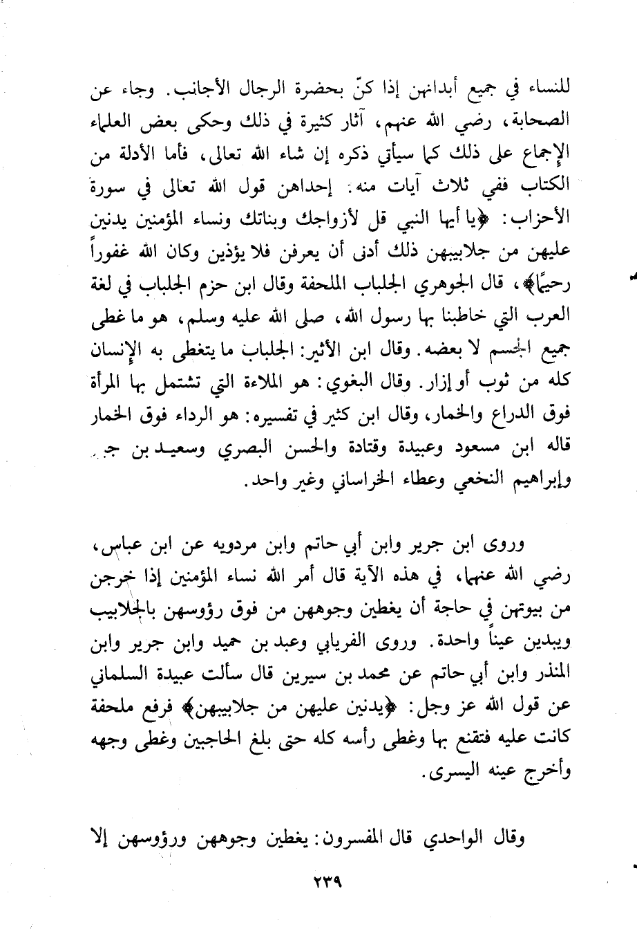 للنساء في جميع أبدانهن إذا كن بحضرة الرجال الأجانب، وجاء عن الصحابة رضي الله عنهم آثار كثيرة في ذلك وحكى بعض العلماء الإجماع على ذلك كما سيأتي ذكره إن شاء الله تعالى فأما الأدلة من الكتاب ففي ثلاث آيات منه: إحداهن قول الله تعالى في سورة الأحزاب {يَا أَيُّهَا النَّبِيُّ قُلْ لِأَزْوَاجِكَ وَبَنَاتِكَ وَنِسَاءِ الْمُؤْمِنِينَ يُدْنِينَ عَلَيْهِنَّ مِنْ جَلَابِيبِهِنَّ ذَلِكَ أَدْنَى أَنْ يُعْرَفْنَ فَلَا يُؤْذَيْنَ وَكَانَ اللَّهُ غَفُورًا رَحِيمًا} قال الجوهري: الجلباب الملحفة وقال ابن حزم الجلباب في لغة العرب التي خاطبنا بها رسول الله - صلى الله عليه وسلم -: هو ما غطى جميع الجسم لا بعضه، وقال ابن الأثير: الجلباب ما يتغطى به الإنسان كله من ثوب أو إزار، وقال البغوي: هو الملاءة التي تشتمل بها المرأة فوق الدرع والخمار، وقال ابن كثير في تفسيره: هو الرداء فوق الخمار قاله ابن مسعود وعبيدة وقتادة والحسن البصري وسعيد بن جبير وإبراهيم النخعي وعطاء الخراساني وغير واحد.