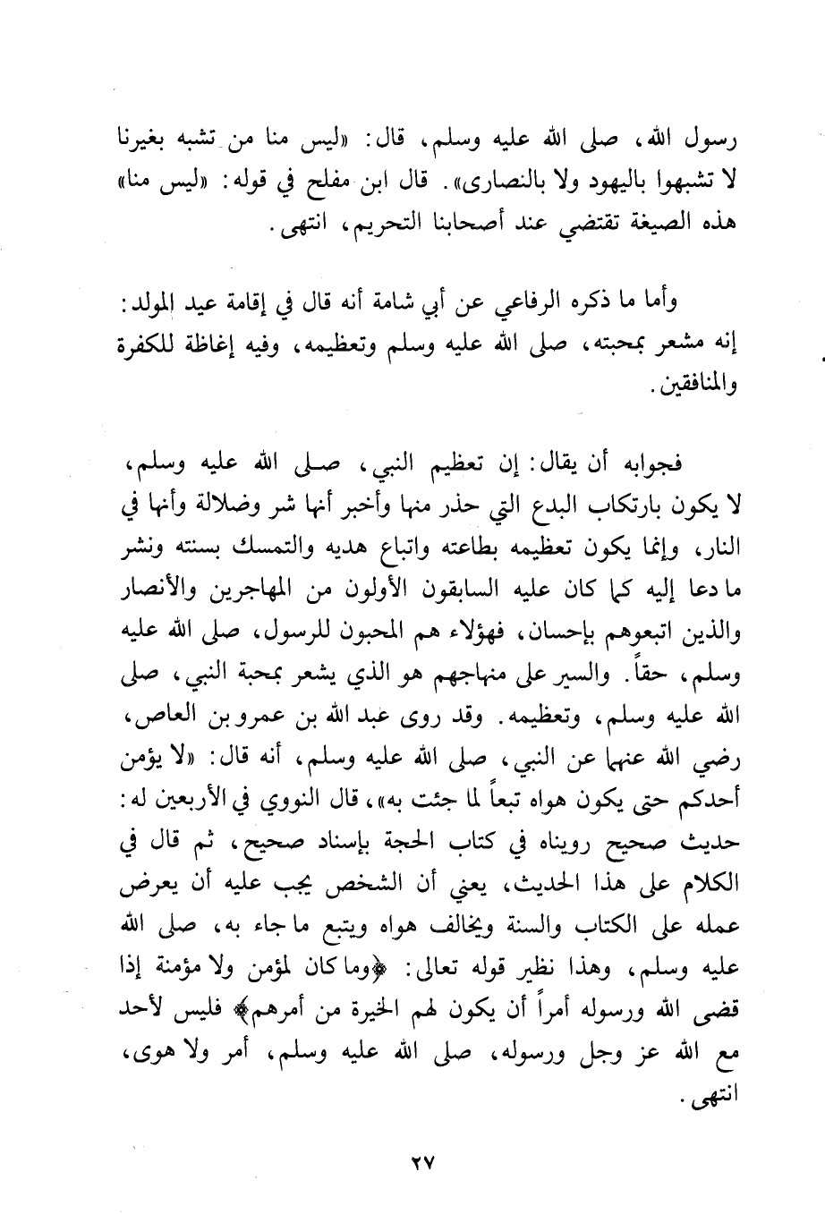 رسول الله - صلى الله عليه وسلم - قال: «ليس منا من تشبه بغيرنا، لا تشبهوا باليهود، ولا بالنصارى»، قال ابن مفلح في قوله: «ليس منا» هذه الصيغة تقتضي عند أصحابنا التحريم، انتهى.
