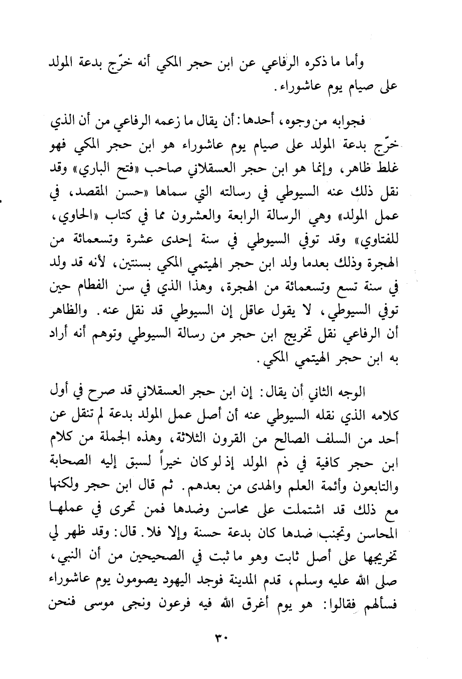 فجوابه من وجوه أحدها: أن يقال ما زعمه الرفاعي من أن الذي خرج بدعة المولد على صيام يوم عاشوراء هو ابن حجر المكي فهو غلط ظاهر، وإنما هو ابن حجر العسقلاني صاحب "فتح الباري"، وقد نقل ذلك عنه السيوطي في رسالته التي سماها "حسن المقصد، في عمل المولد" وهي الرسالة الرابعة والعشرون مما في كتاب "الحاوي للفتاوي" وقد توفي السيوطي في سنة إحدى عشرة وتسع مائة من الهجرة، وذلك بعدما ولد ابن حجر الهيتمي المكي بسنتين؛ لأنه قد ولد في سنة تسع وتسع مائة من الهجرة، وهذا الذي في سن الفطام حين توفي السيوطي، لا يقول عاقل إن السيوطي قد نقل عنه، والظاهر أن الرفاعي نقل تخريج ابن حجر من رسالة السيوطي، وتوهم أنه أراد به ابن حجر الهيتمي المكي.