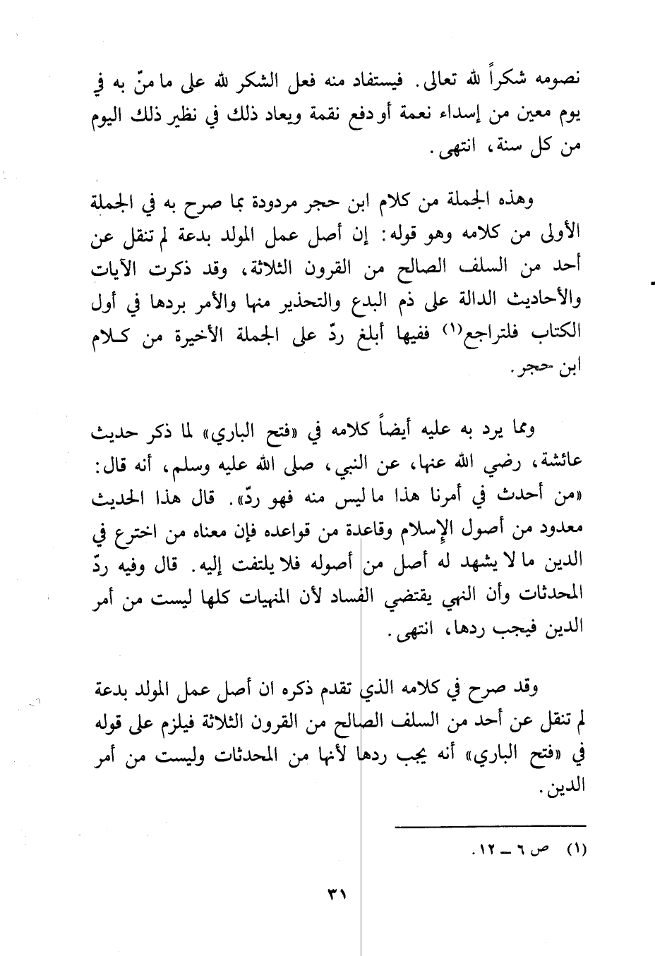 وقد صرح في كلامه الذي تقدم ذكره أن أصل عمل المولد بدعة لم تنقل عن أحد من السلف الصالح من القرون الثلاثة فيلزم على قوله في "فتح الباري" أنه يجب ردها؛ لأنها من المحدثات وليست من أمر الدين.