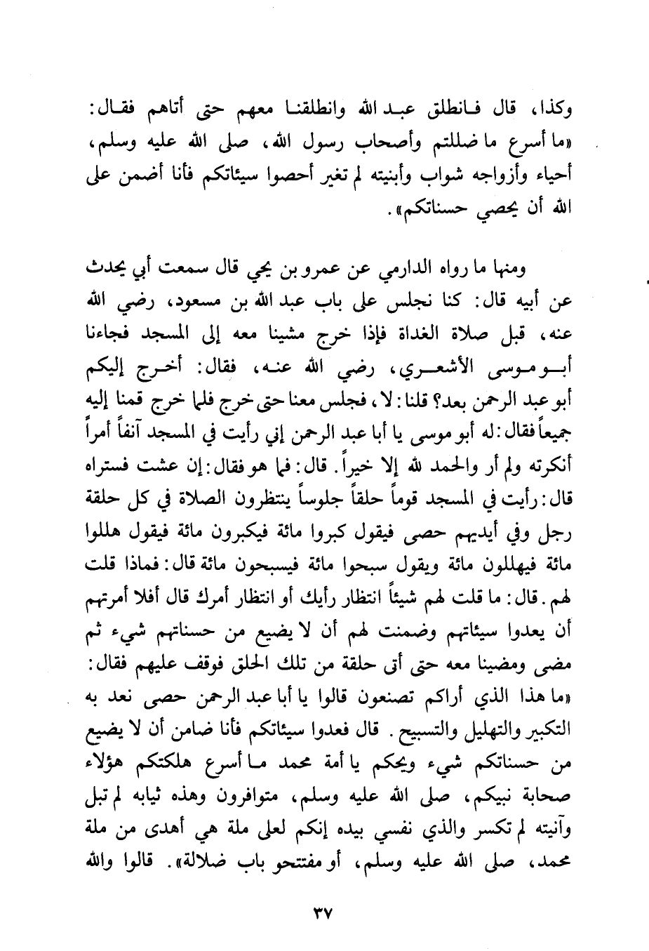 ومنها ما رواه الدارمي عن عمرو بن يحيى قال: سمعت أبي يحدث عن أبيه، قال: كنا نجلس على باب عبد الله بن مسعود -رضي الله عنه- قبل صلاة الغداة، فإذا خرج مشينا معه إلى المسجد، فجاءنا أبو موسى الأشعري -رضي الله عنه- فقال: أخرج إليكم أبو عبد الرحمن بعد؟ قلنا: لا، فجلس حتى خرج، فلما خرج قمنا إليه جميعًا فقال: له أبو موسى يا أبا عبد الرحمن إني رأيت في المسجد آنفا أمرًا أنكرته، ولم أر والحمد لله إلا خيرًا، قال: فما هو فقال: إن عشت فستراه، قال: رأيت في المسجد قومًا حلقًا جلوسًا، ينتظرون الصلاة في كل حلقة رجل، وفي أيديهم حصى، فيقول: كبروا مائة فيكبرون مائة، فيقول: هللوا مائة فيهللون مائة، ويقول: سبحوا مائة فيسبحون مائة، قال: فماذا قلت لهم. قال: ما قل لهم شيئًا انتظار رأيك أو انتظار أمرك، قال: أفلا أمرتهم أن يعدوا سيئاتهم، وضمنت لهم أن لا يضيع من حسناتهم شيء، ثم مضى ومضينا معه حتى أتى حلقة من تلك الحق، فوقف عليهم فقال: «ما هذا الذي أراكم تصنعون» قالوا يا أبا عبد الرحمن حصى نعد به التكبير، والتهليل، والتسبيح، قال: فعدوا سيئاتكم فأنا ضامن أن لا يضيع من حسناتكم شيء، ويحكم يا أمة محمد ما أسرع هلكتكم، هؤلاء صحابة نبيكم - صلى الله عليه وسلم - متوافرون، وهذه ثيابه لم تبل، وآنيته لم تكسر، والذي نفسي بيده إنكم لعلى ملة هي أهدى من ملة محمد - صلى الله عليه وسلم -، أو مفتتحو باب ضلالة، قالوا: والله