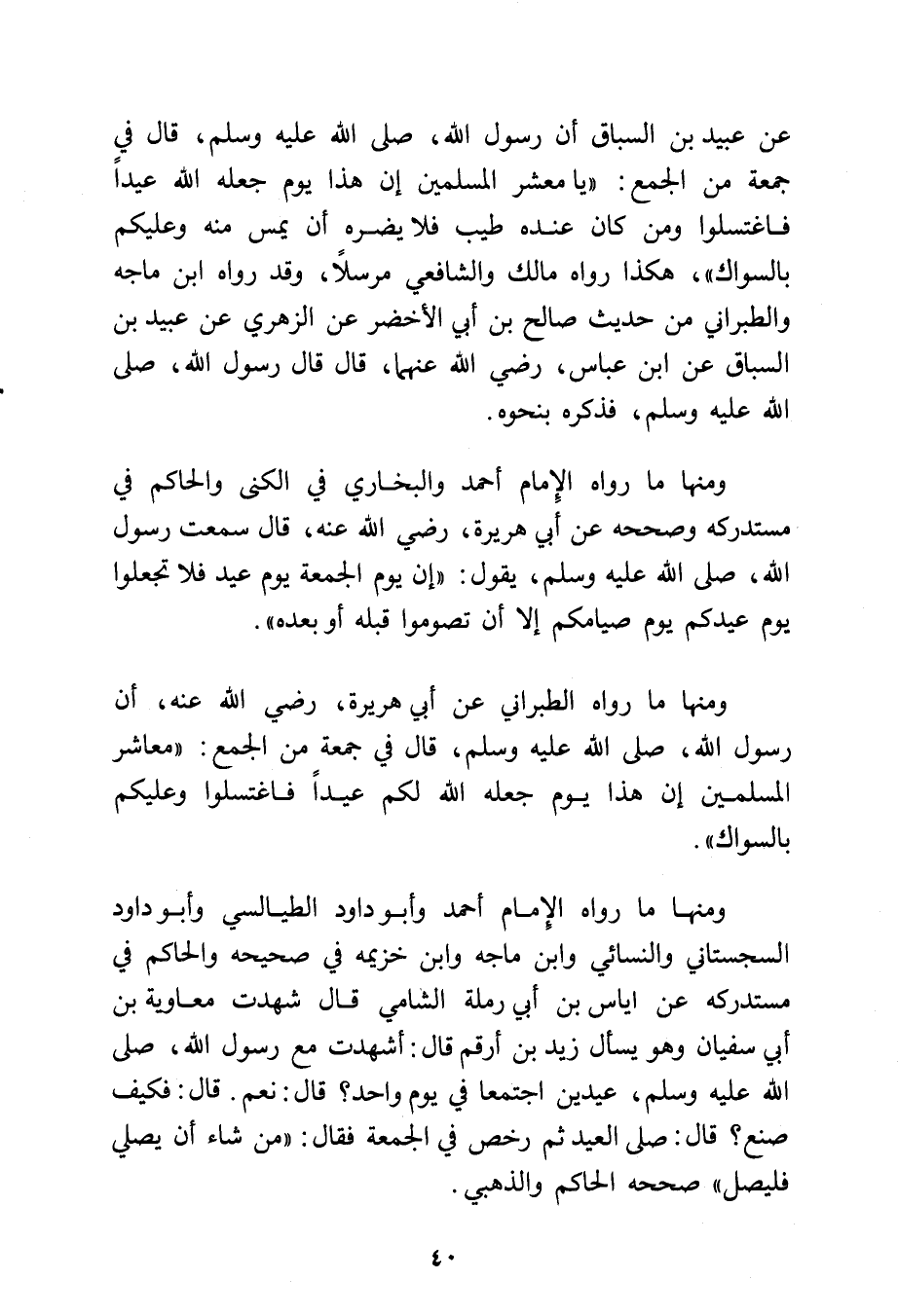 ومنها ما رواه الطبراني عن أبي هريرة، رضي الله عنه أن رسول الله - صلى الله عليه وسلم - قال في جمعة من الجمع: «معاشر المسلمين إن هذا يوم جعله الله لكم عيدًا، فاغتسلوا، وعليكم بالسواك».