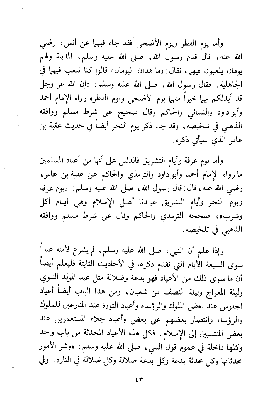 وإذا علم أن النبي - صلى الله عليه وسلم - لم يشرع لأمته عيدًا سوى السبعة الأيام التي تقدم ذكرها في الأحاديث الثابتة فليعلم أيضًا أن ما سوى ذلك من الأعياد فهو بدعة وضلالة مثل عيد المولد النبوي، وليلة المعراج، وليلة النصف من شعبان، ومن هذا الباب أيضًا أعياد الجلوس عند بعض الملوك والرؤساء، وأعياد الثورة عند المنازعين للملوك والرؤساء وانتصار بعضهم على بعض، وأعياد جلاء المستعمرين عند بعض المنتسبين إلى الإسلام، فكل هذه الأعياد المحدثة من باب واحد وكلها داخلة في عموم قول النبي - صلى الله عليه وسلم - «وشر الأمور محدثاتها، وكل محدثة بدعة، وكل بدعة ضلالة، وكل ضلالة في النار»، وفي