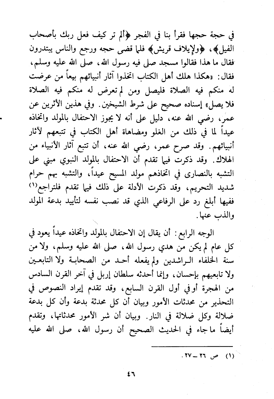 في حجة حجها، فقرأ بنا في الفجر {أَلَمْ تَرَ كَيْفَ فَعَلَ رَبُّكَ بِأَصْحَابِ الْفِيلِ}، {لِإِيلَافِ قُرَيْشٍ} فلما قضى حجه، ورجع والناس يبتدرون، فقال: ما هذا، فقال: مسجد صلى فيه رسول الله - صلى الله عليه وسلم -، فقال: «هكذا هلك أهل الكتاب اتخذوا آثار أنبيائهم بيعًا، من عرض له منكم فيه الصلاة فليصل، ومن لم تعرض له منكم فيه الصلاة فلا يصل» إسناده صحيح على شرط الشيخين، وفي هذين الأثرين عن عمر -رضي الله عنه- دليل على أنه لا يجوز الاحتفال بالمولد واتخاذه عيدًا لما في ذلك من الغلو ومضاهاة أهل الكتاب في تتبعهم لآثار أنبيائهم، وقد صرح عمر -رضي الله عنه-، أن تتبع آثار الأنبياء من الهلاك، وقد ذكرت فيما تقدم أن الاحتفال بالمولد النبوي مبني على التشبه بالنصارى في اتخاذهم مولد المسيح عيدًا والتشبه بهم حرام شديد التحريم، وقد ذكرت الأدلة على ذلك فيما تقدم فلتراجع (¬1) ففيها أبلغ رد على الرفاعي الذي قد نصب نفسه لتأييد بدعة المولد والذبّ عنها.