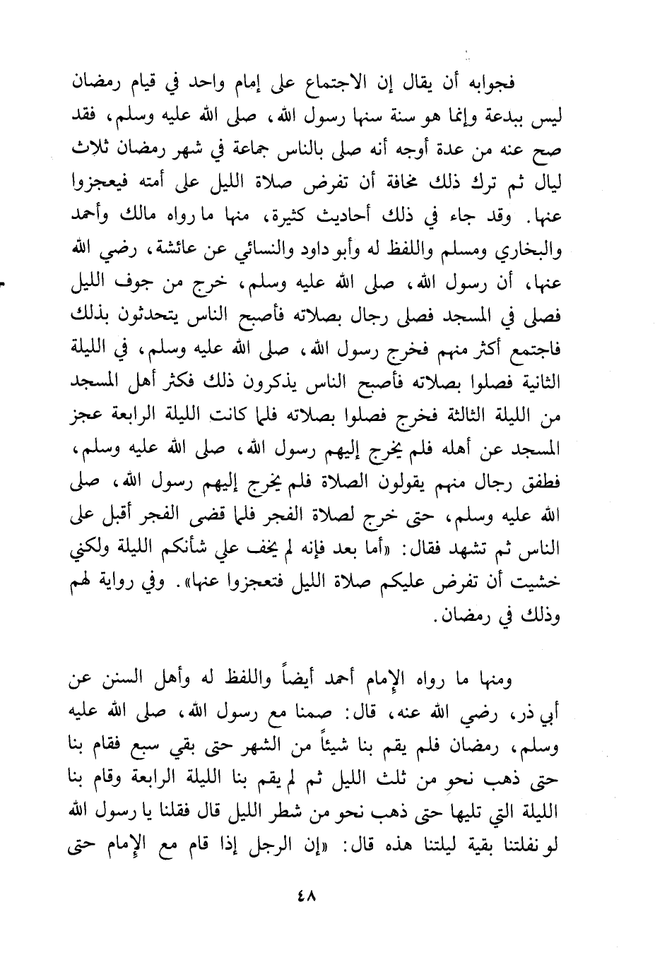 ومنها ما رواه الإمام أحمد أيضًا واللفظ له، وأهل السنن عن أبي ذر رضي الله عنه قال: صمنا مع رسول الله - صلى الله عليه وسلم - رمضان فلم يقم بنا شيئا من الشهر حتى بقي سبع، فقام بنا حتى ذهب نحو من ثلث الليل، ثم لم يقم بنا الليلة الرابعة، وقام بنا الليلة التي تليها حتى ذهب نحو من شطر الليل، قال: فقلنا يا رسول الله لو نفلتنا بقية ليلتنا هذه قال: «إن الرجل إذا قام مع الإمام حتى