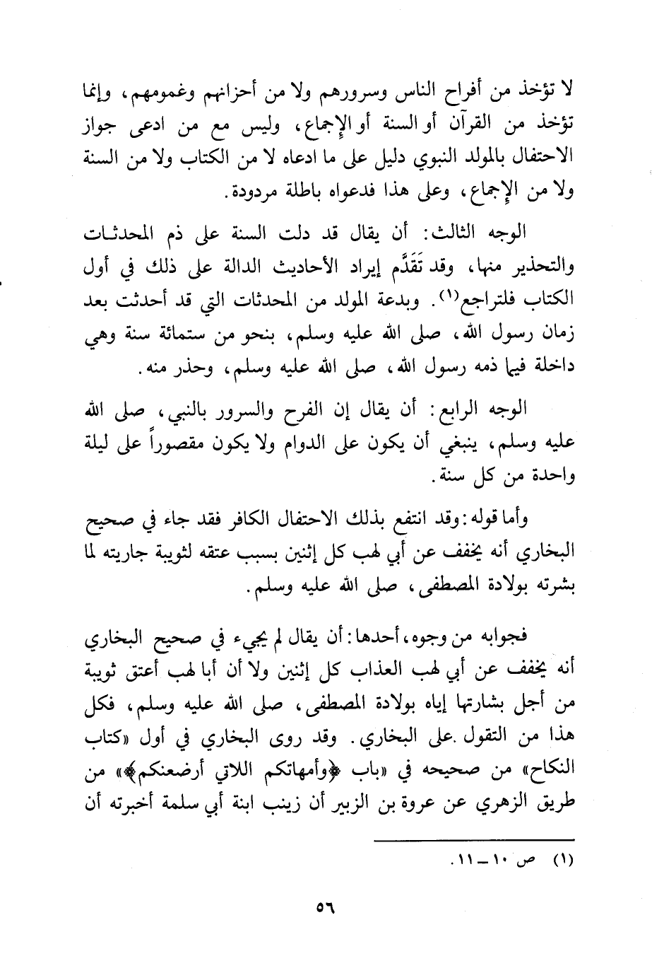 فجوابه من وجوه أحدها: أن يقال لم يجيء في صحيح البخاري أنه يخفف عن أبي لهب العذاب كل اثنين ولا أن أبا لهب أعتق ثويبة من أجل بشرتها إياه بولادة المصطفى - صلى الله عليه وسلم -، فكل هذا من التقول على البخاري، وقد روى البخاري في أول "كتاب النكاح" من صحيحه في باب {وَأُمَّهَاتُكُمُ اللَّاتِي أَرْضَعْنَكُمْ} من طريق الزهري عن عروة بن الزبير أن زينب ابنة أبي سلمة أخبرته أن