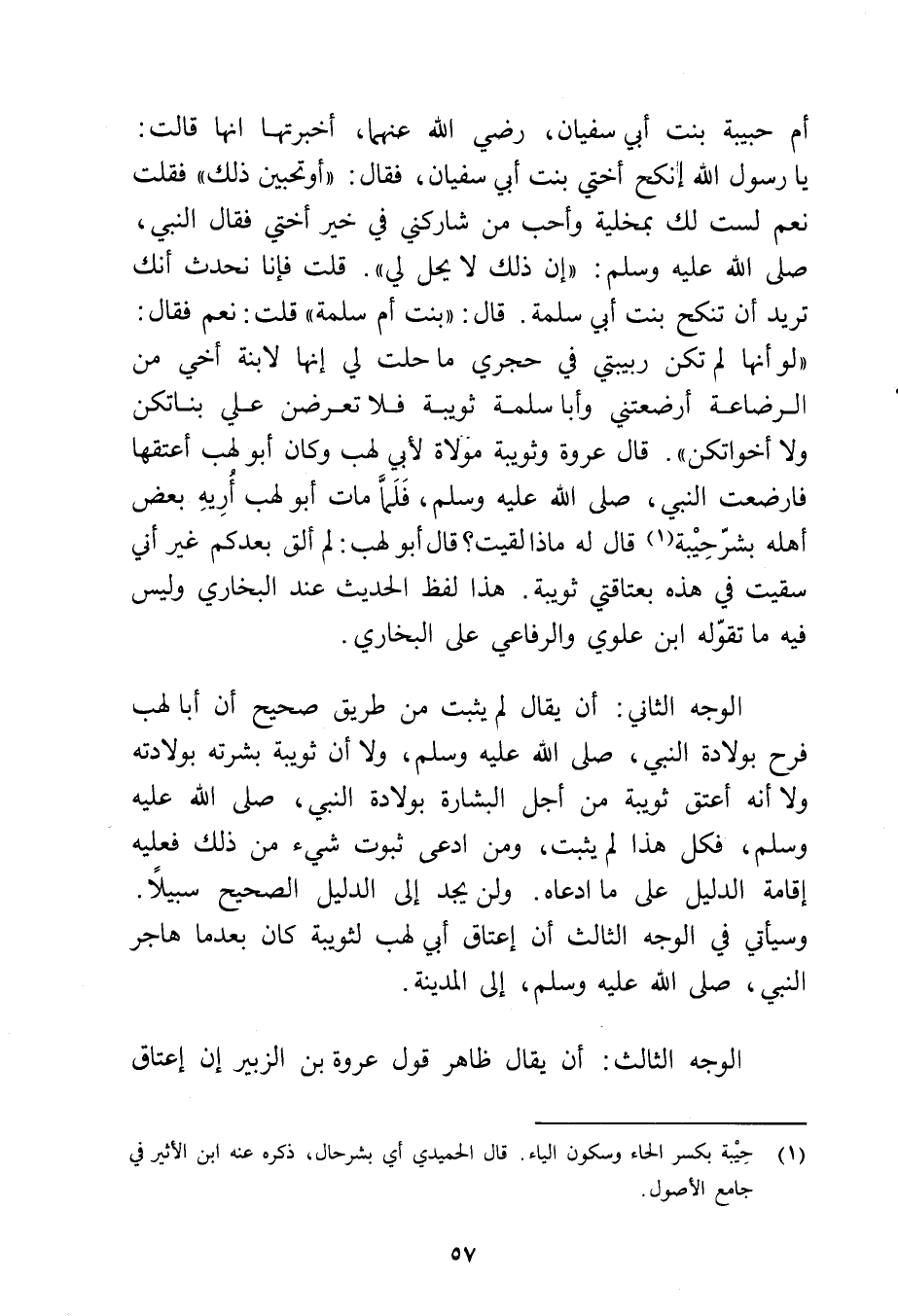 أم حبيبة بنت أبي سفيان -رضي الله عنهما- أخبرتها إنها قالت: يا رسول الله انكح أختي بنت أبي سفيان، فقال: «أو تحبين ذلك»، فقلت: نعم لست لك بمخيلة، وأحب من شاركني في خير أختي، فقال النبي - صلى الله عليه وسلم -: «إن ذلك لا يحل لي»، قلت: فإنا نحدث أنك تريد أن تنكح بنت أبي سلمة، قال: «بنت أم سلمة» قلت: نعم، فقال: «لو أنها لم تكن ربيبتي في حجري ما حلت لي، إنها لابنة أخي من الرضاعة أرضعتني وأبا سلمة ثويبة، فلا تعرضن على بناتكن، ولا أخواتكن» قال عروة وثويبة مولاة لأبي لهب، وكان أبو لهب أعتقها فأرضعت النبي - صلى الله عليه وسلم -، فلما مات أبو لهب أُريه بعض أهله بشرِّ حِيْبة (¬1) قال له ماذا لقيت؟ قال أبو لهب: لم ألق بعدكم غير أني سقيت في هذه بعتاقتي ثويبة، هذا لفظ الحديث عند البخاري، وليس فيه ما تقوَّله ابن علوي والرفاعي على البخاري.