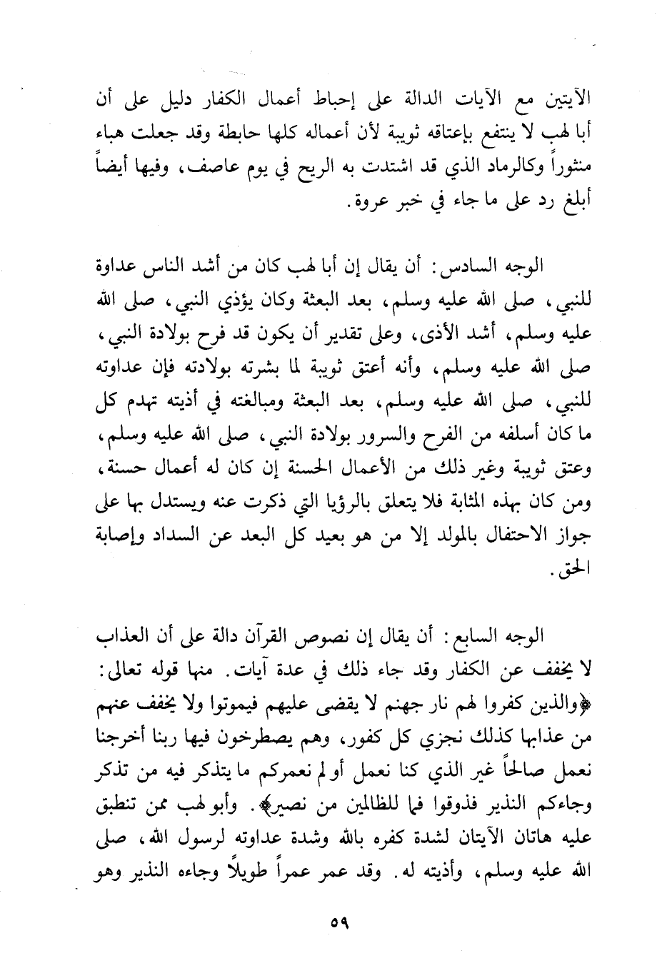 الوجه السادس: أن يقال إن أبا لهب كان من أشد الناس عداوة للنبي - صلى الله عليه وسلم - بعد البعثة، وكان يؤذي النبي - صلى الله عليه وسلم - أشد الأذى، وعلى تقدير أن يكون قد فرح بولادة النبي - صلى الله عليه وسلم -، وأنه أعتق ثويبة لما بشرته بولادته، فإن عداوته للنبي - صلى الله عليه وسلم - بعد البعثة ومبالغته في أذيته تهدم كل ما كان أسلفه من الفرح والسرور بولادة النبي - صلى الله عليه وسلم -، وعتق ثويبة وغير ذلك من الأعمال الحسنة إن كان له أعمال حسنة، ومن كان بهذه المثابة فلا يتعلق بالرؤيا التي ذكرت عنه ويستدل بها على جواز الاحتفال بالمولد، إلا من هو بعيد كل البعد عن السداد وإصابة الحق.