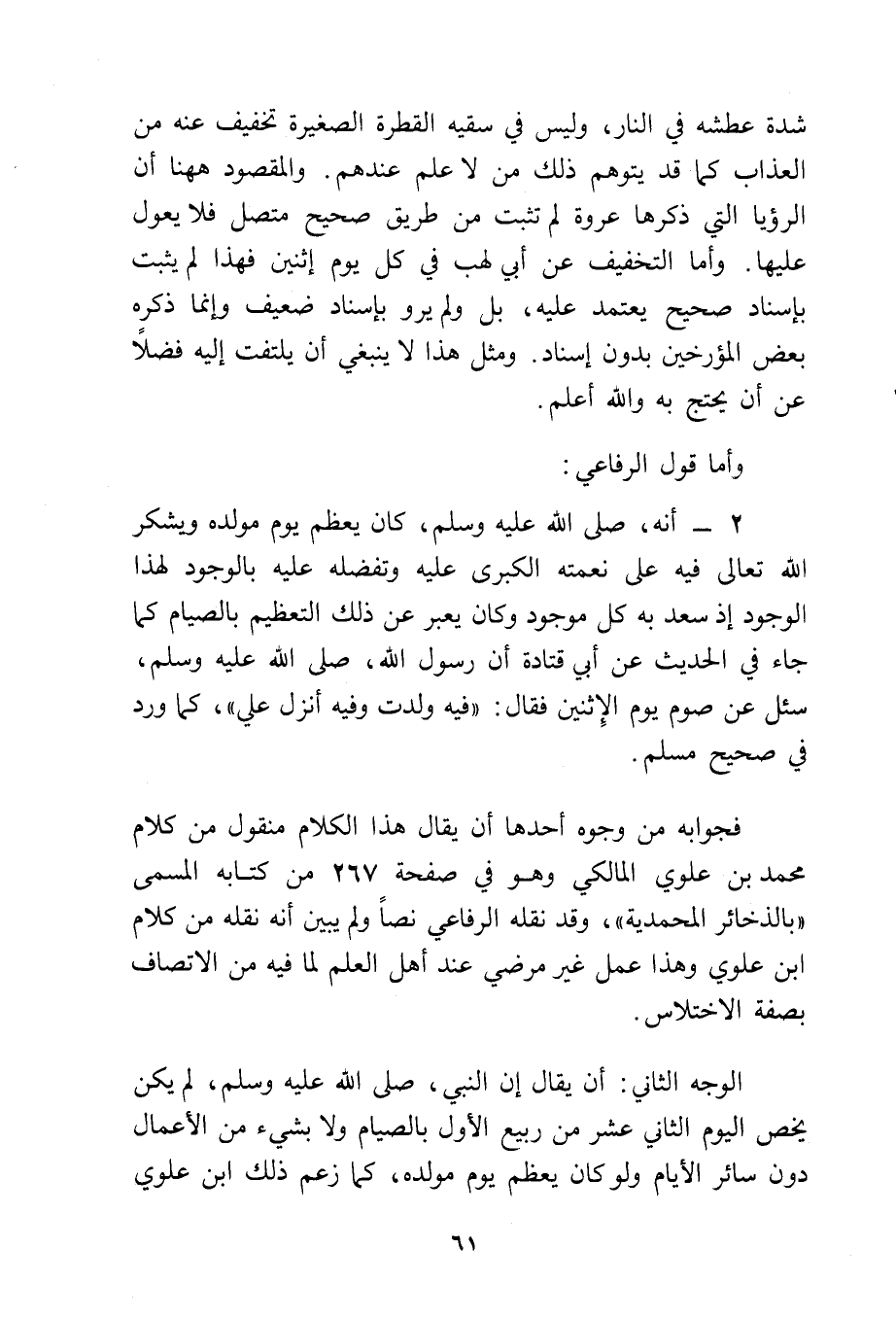 الوجه الثاني: أن يقال إن النبي - صلى الله عليه وسلم - لم يكن يخص اليوم الثاني عشر من ربيع الأول بالصيام، ولا بشيء من الأعمال دون سائر الأيام، ولو كان يعظم يوم مولده كما زعم ذلك ابن علوي