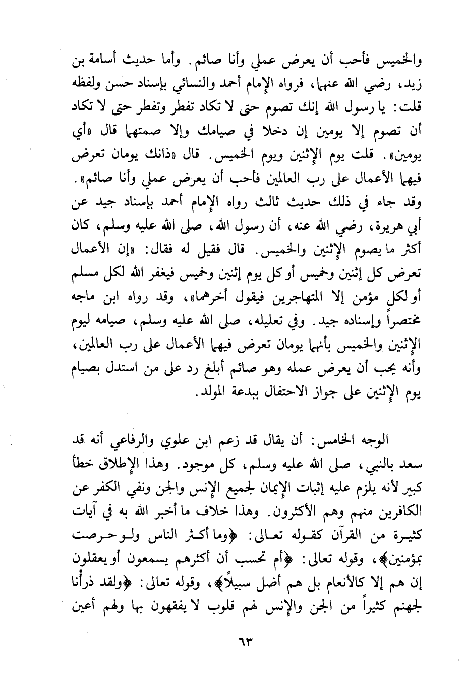 وأما حديث أسامة بن زيد -رضي الله عنهما- فرواه الإمام أحمد، والنسائي بإسناد حسن ولفظه قلت: يا رسول الله إنك تصوم حتى لا تكاد تفطر، وتفطر حتى لا تكاد أن تصوم إلا يومين إن دخلا في صيامك وإلا صمتهما، قال: «أي يومين»، قلت: يوم الاثنين ويوم الخميس. قال: «ذانك يومان تعرض فيهما الأعمال على رب العالمين، فأحب أن يعرض عملي وأنا صائم»، وقد جاء في ذلك حديث ثالث رواه الإمام أحمد بإسناد جيد عن أبي هريرة رضي الله عنه، أن رسول الله - صلى الله عليه وسلم - كان أكثر ما يصوم الاثنين والخميس. قال فقيل له فقال: «إن الأعمال تعرض كل اثنين وخميس أو كل يوم اثنين وخميس، فيغفر الله لكل مسلم أو لكل مؤمن إلا المتهاجرين فيقول أخرهما»، وقد رواه ابن ماجه مختصرًا وإسناده جيد، وفي تعليله - صلى الله عليه وسلم - صيامه ليوم الاثنين والخميس بأنهما يومان تعرض فيهما الأعمال على رب العالمين، وأنه يحب أن يعرض عمله وهو صائم أبلغ رد على من استدل بصيام يوم الاثنين على جواز الاحتفال ببدعة المولد.