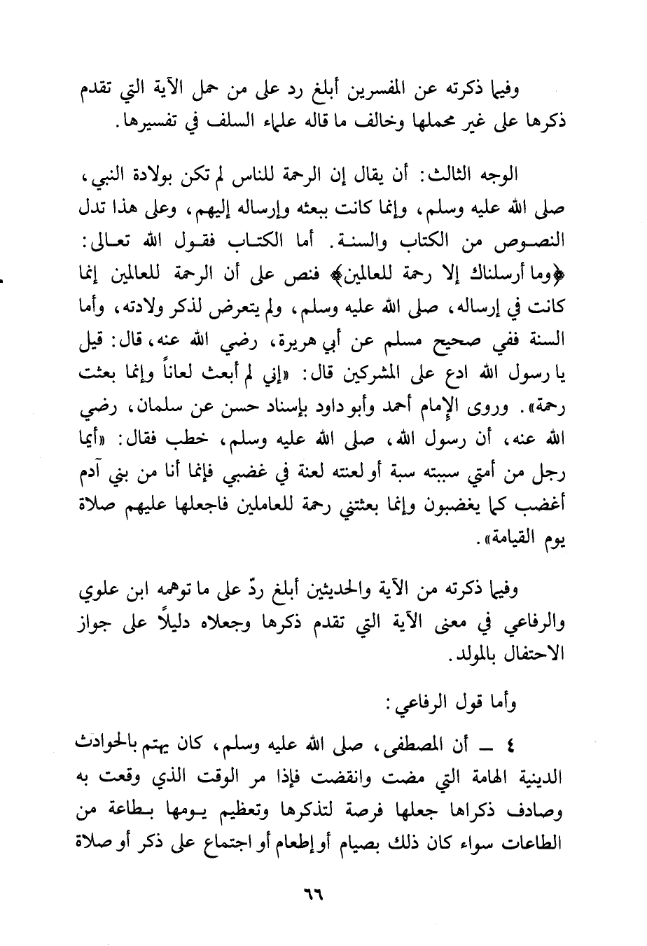 وفيما ذكرته من الآية والحديثين أبلغ رد على ما توهمه ابن علوي والرفاعي في معنى الآية التي تقدم ذكرها، وجعلاه دليلا على جواز الاحتفال بالمولد.