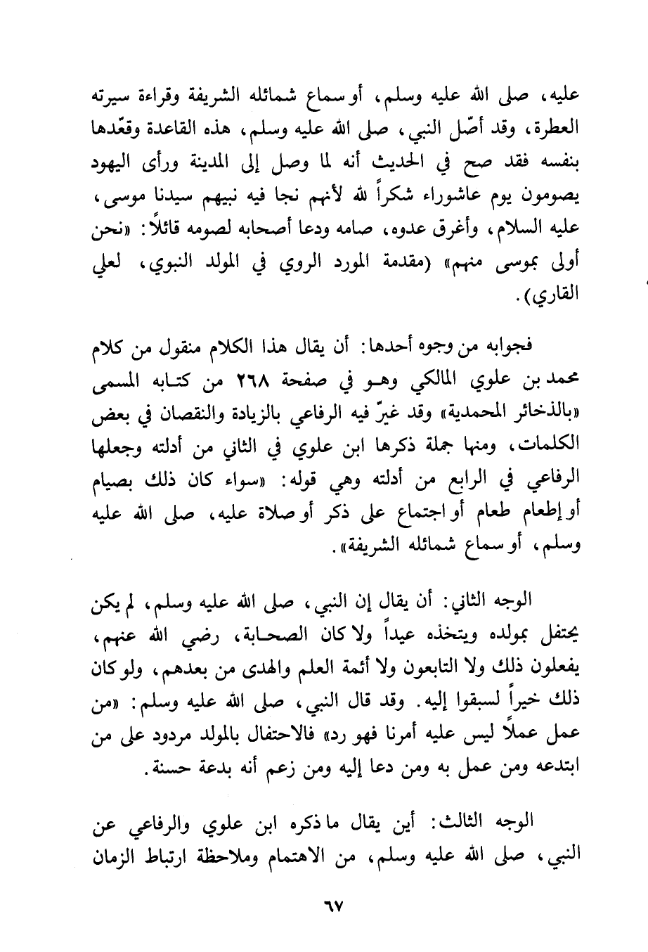 فجوابه من وجوه أحدها: أن يقال هذا الكلام منقول من كلام محمد بن علوي المالكي وهو في صفحة 268 من كتابه المسمى "بالذخائر المحمدية"، وقد غير فيه الرفاعي بالزيادة والنقصان في بعض الكلمات، ومنها جملة ذكرها ابن علوي في الثاني من أدلته وجعلها الرفاعي في الرابع من أدلته وهي قوله: سواء كان ذلك بصيام، أو إطعام طعام، أو اجتماع على ذكر، أو صلاة عليه - صلى الله عليه وسلم -، أو سماع شمائله الشريفة.