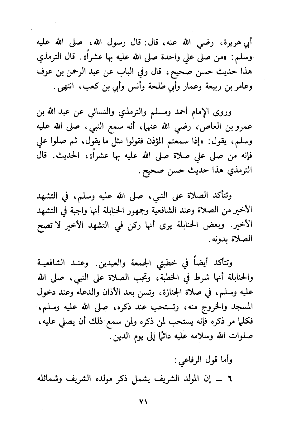 أبي هريرة رضي الله عنه قال: قال رسول الله - صلى الله عليه وسلم -: «من صلى علي واحدة صلى الله عليه بها عشرًا» قال الترمذي: هذا حديث حسن صحيح، قال وفي الباب عن عبد الرحمن بن عوف، وعامر بن ربيعة، وعمار، وأبي طلحة، وأنس، وأبي بن كعب انتهى.