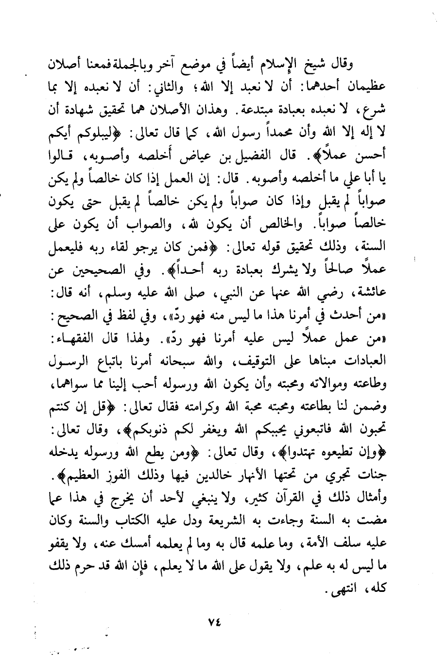 وقال شيخ الإسلام أيضًا في موضع آخر وبالجملة فمعنا أصلان عظيمان أحدهما: أن لا نعبد إلا الله؛ والثاني: أن لا نعبده إلا بما شرع لا نعبده بعبادة مبتدعة، وهذان الأصلان هما تحقيق شهادة أن لا إله الله وأن محمدًا رسول الله كما قال تعالى: {لِيَبْلُوَكُمْ أَيُّكُمْ أَحْسَنُ عَمَلاً}، قال الفضيل بن عياض: أخلصه وأصوبه، قالوا يا أبا علي ما أخلصه وأصوبه.