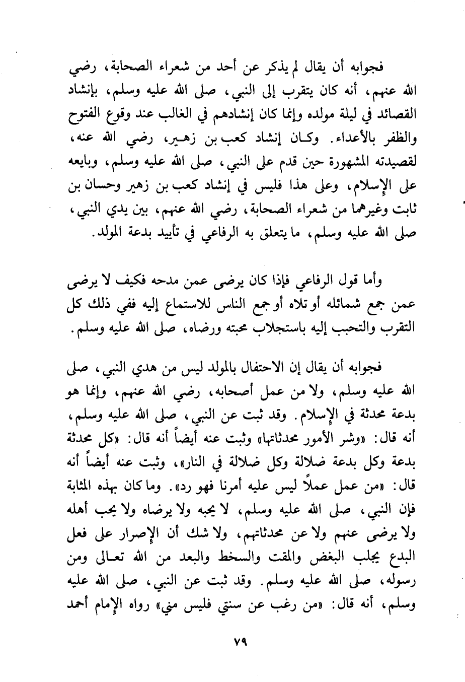 فجوابه أن يقال: لم يذكر عن أحد من شعراء الصحابة -رضي الله عنهم- أنه كان يتقرب إلى النبي - صلى الله عليه وسلم - بإنشاد القصائد في ليلة مولده، وإنما كان إنشادهم في الغالب عند وقوع الفتوح، والظفر بالأعداء. وكان إنشاد كعب بن زهير -رضي الله عنه- لقصيدته المشهورة حين قدم على النبي - صلى الله عليه وسلم - وبايعه على الإسلام، وعلى هذا فليس في إنشاد كعب بن زهير وحسان بن ثابت وغيرهما من شعراء الصحابة -رضي الله عنهم- بين يدي النبي - صلى الله عليه وسلم - ما يتعلق به الرفاعي في تأييد بدعة المولد.
