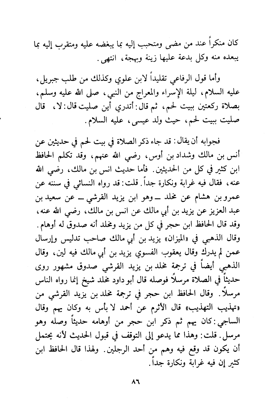 وأما قول الرفاعي تقليدًا لابن علوي: وكذلك من طلب جبريل -عليه السلام- ليلة الإسراء والمعراج من النبي، - صلى الله عليه وسلم - بصلاة ركعتين ببيت لحم، ثم قال: أتدري أين صليت قال: لا، قال: صليت ببيت لحم، حيث ولد عيسى عليه السلام.