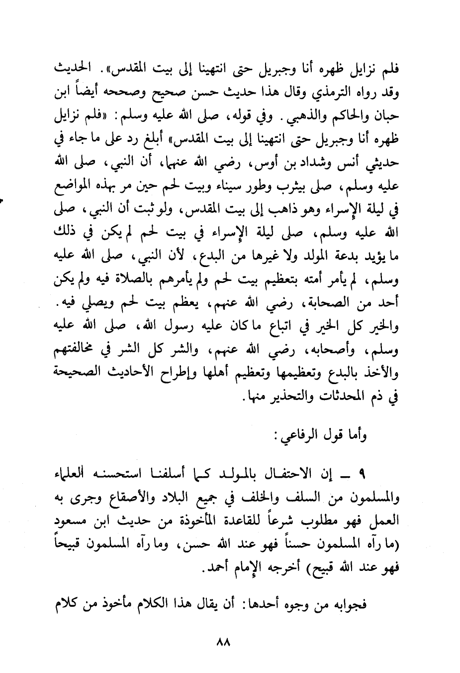 وفي قوله: - صلى الله عليه وسلم - «فلم نزايل ظهره أنا وجبريل حتى انتهينا إلى بيت المقدس» أبلغ رد على ما جاء في حديثي أنس، وشداد بن أوس -رضي الله عنهما- أن النبي - صلى الله عليه وسلم - صلى بيثرب، وطور سيناء، وبيت لحم حين مر بهذه المواضع في ليلة الإسراء وهو ذاهب إلى بيت المقدس، ولو ثبت أن النبي - صلى الله عليه وسلم - صلى ليلة الإسراء في بيت لحم لم يكن في ذلك ما يؤيد بدعة المولد ولا غيرها من البدع؛ لأن النبي - صلى الله عليه وسلم - لم يأمر أمته بتعظيم بيت لحم، ولم يأمرهم بالصلاة فيه، ولم يكن أحد من الصحابة -رضي الله عنهم- يعظم بيت لحم ويصلي فيه والخير كل الخير في اتباع ما كان عليه رسول الله - صلى الله عليه وسلم - وأصحابه رضي الله عنهم، والشر كل الشر في مخالفتهم، والأخذ بالبدع وتعظيمها وتعظيم أهلها، وإطراح الأحاديث الصحيحة في ذم المحدثات والتحذير منها.