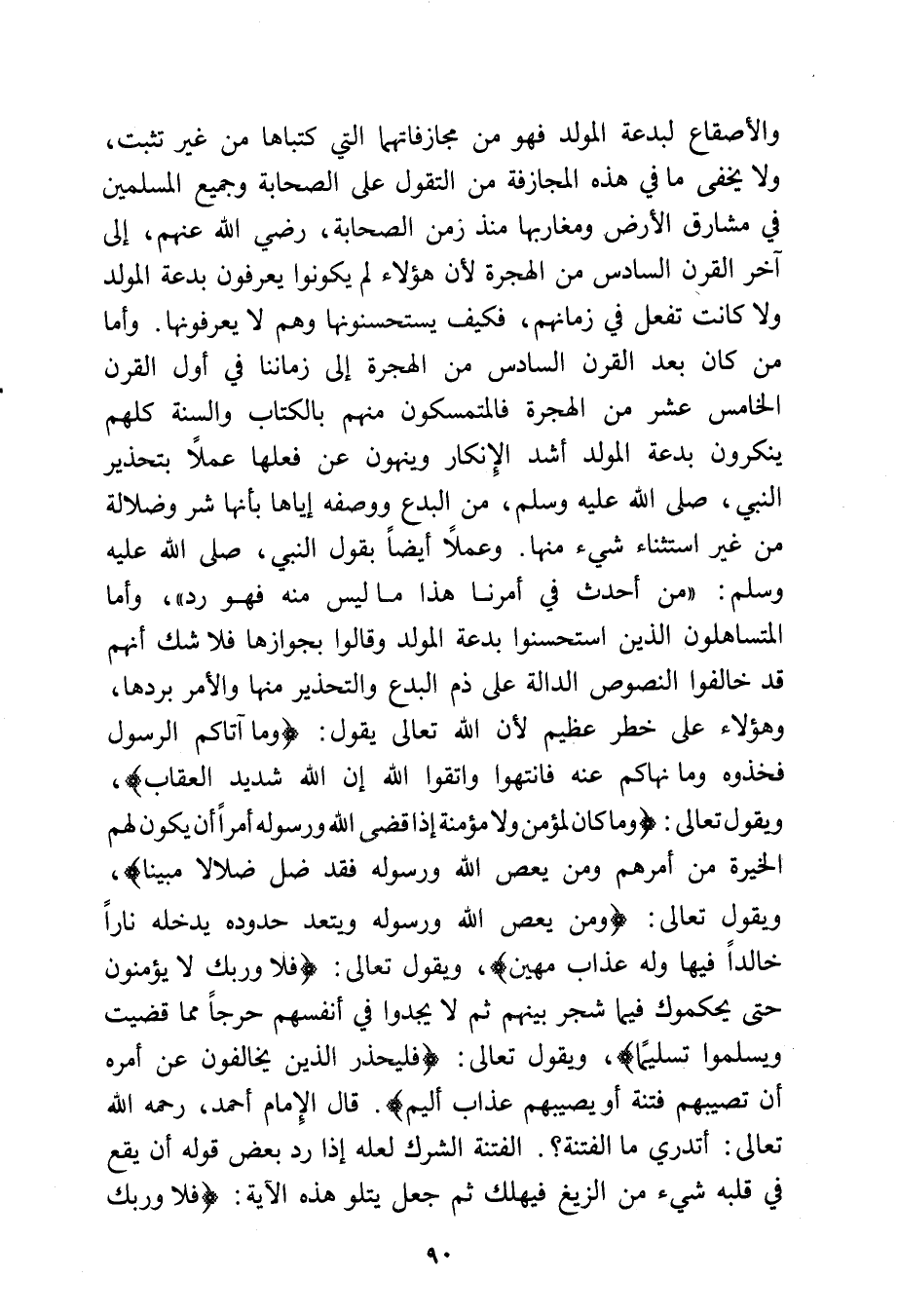 وأما من كان بعد القرن السادس من الهجرة إلى زماننا في أول القرن الخامس عشر من الهجرة، فالمتمسكون منهم بالكتاب والسنة كلهم ينكرون بدعة المولد أشد الإنكار وينهون عن فعلها عملاً بتحذير النبي - صلى الله عليه وسلم - من البدع، ووصفه إياها بأنها شر وضلالة من غير استثناء شيء منها، وعملاً أيضًا بقول النبي - صلى الله عليه وسلم - «من أحدث في أمرنا هذا ما ليس منه فهو رد»، وأما المتساهلون الذين استحسنوا بدعة المولد وقالوا بجوازها فلا شك أنهم قد خالفوا النصوص الدالة على ذم البدع والتحذير منها والأمر بردها، وهؤلاء على خطر عظيم؛ لأن الله تعالى يقول: {وَمَا آَتَاكُمُ الرَّسُولُ فَخُذُوهُ وَمَا نَهَاكُمْ عَنْهُ فَانْتَهُوا وَاتَّقُوا اللَّهَ إِنَّ اللَّهَ شَدِيدُ الْعِقَابِ}، ويقول تعالى: {وَمَا كَانَ لِمُؤْمِنٍ وَلَا مُؤْمِنَةٍ إِذَا قَضَى اللَّهُ وَرَسُولُهُ أَمْرًا أَنْ يَكُونَ لَهُمُ الْخِيَرَةُ مِنْ أَمْرِهِمْ وَمَنْ يَعْصِ اللَّهَ وَرَسُولَهُ فَقَدْ ضَلَّ ضَلَالاً مُبِينًا}، ويقول تعالى: {وَمَنْ يَعْصِ اللَّهَ وَرَسُولَهُ وَيَتَعَدَّ حُدُودَهُ يُدْخِلْهُ نَارًا خَالِدًا فِيهَا وَلَهُ عَذَابٌ مُهِينٌ}، ويقول تعالى: {فَلَا وَرَبِّكَ لَا يُؤْمِنُونَ حَتَّى يُحَكِّمُوكَ فِيمَا شَجَرَ بَيْنَهُمْ ثُمَّ لَا يَجِدُوا فِي أَنْفُسِهِمْ حَرَجًا مِمَّا قَضَيْتَ وَيُسَلِّمُوا تَسْلِيمًا}، ويقول تعالى: {فَلْيَحْذَرِ الَّذِينَ يُخَالِفُونَ عَنْ أَمْرِهِ أَنْ تُصِيبَهُمْ فِتْنَةٌ أَوْ يُصِيبَهُمْ عَذَابٌ أَلِيمٌ} قال الإمام أحمد رحمه الله تعالى: أتدري ما الفتنة؟ الفتنة الشرك لعله إذا رد بعض قوله أن يقع في قلبه شيء من الزيغ فيهلك، ثم جعل يتلو هذه الآية.