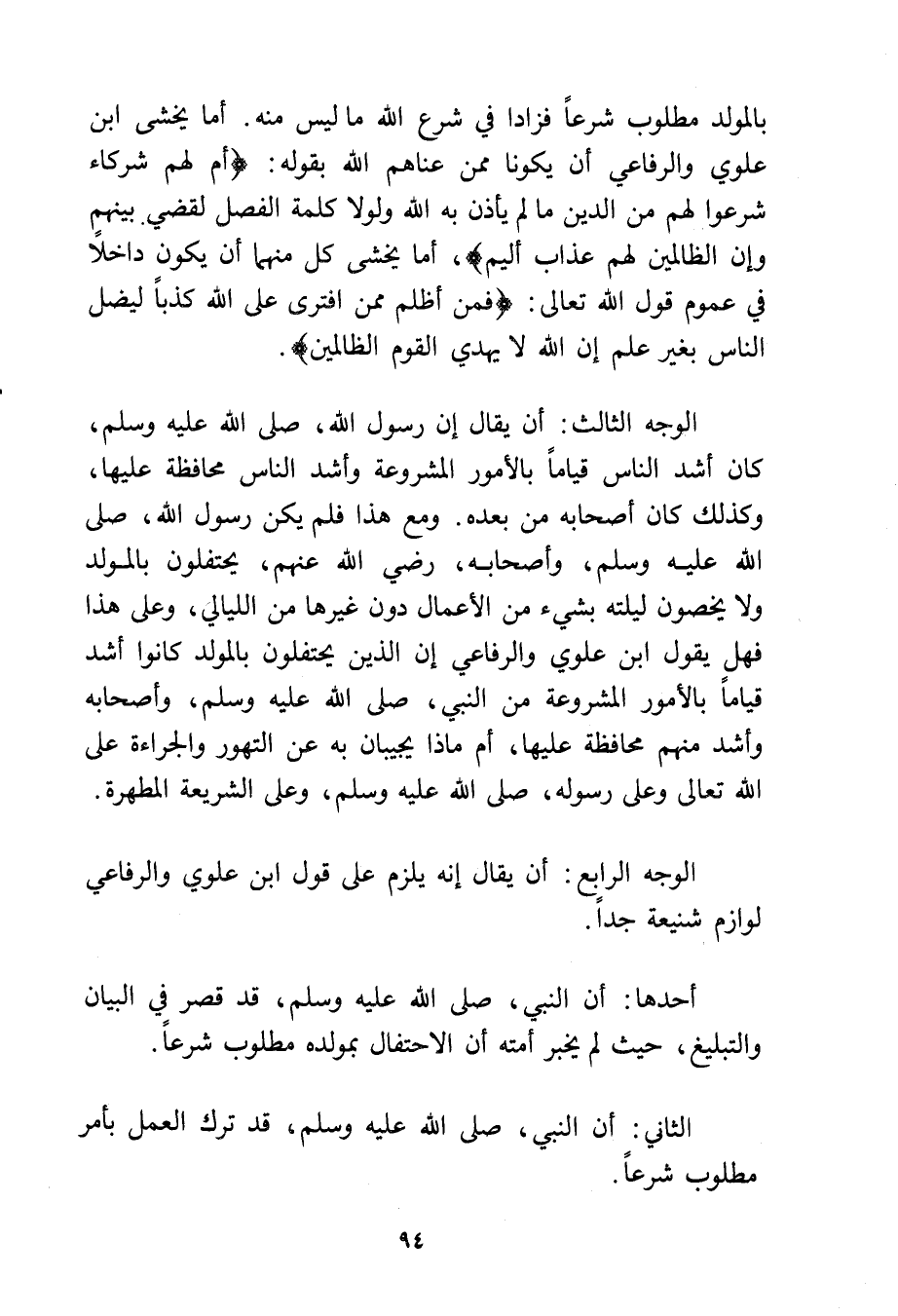 بالمولد مطلوب شرعًا فزادا في شرع الله ما ليس منه، أما يخشى ابن علوي والرفاعي أن يكونا ممن عناهم الله بقوله: {أَمْ لَهُمْ شُرَكَاءُ شَرَعُوا لَهُمْ مِنَ الدِّينِ مَا لَمْ يَاذَنْ بِهِ اللَّهُ وَلَوْلَا كَلِمَةُ الْفَصْلِ لَقُضِيَ بَيْنَهُمْ وَإِنَّ الظَّالِمِينَ لَهُمْ عَذَابٌ أَلِيمٌ} أما يخشى كل منهما أن يكون داخلا في عموم قول الله تعالى: {فَمَنْ أَظْلَمُ مِمَّنِ افْتَرَى عَلَى اللَّهِ كَذِبًا لِيُضِلَّ النَّاسَ بِغَيْرِ عِلْمٍ إِنَّ اللَّهَ لَا يَهْدِي الْقَوْمَ الظَّالِمِينَ}.