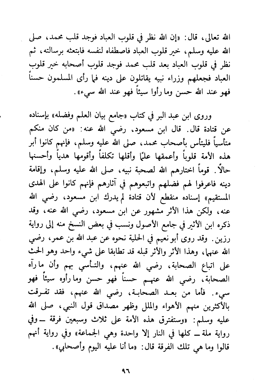 وروى ابن عبد البر في كتاب «جامع بيان العلم وفضله» بإسناده عن قتادة قال. قال ابن مسعود رضي الله عنه: «من كان منكم متأسيًا فليتأس بأصحاب محمد - صلى الله عليه وسلم - فإنهم كانوا أبر هذه الأمة قلوبًا وأعمقها علمًا وأقلها تكلفًا وأقومها هديًا وأحسنها حالا قومًا اختارهم الله لصحبة نبيه - صلى الله عليه وسلم - وإقامة دينه فاعرفوا لهم فضلهم واتبعوهم في آثارهم فإنهم كانوا على الهدى المستقيم» إسناده منقطع لأن قتادة لم يدرك ابن مسعود رضي الله عنه، ولكن هذا الأثر مشهور عن ابن مسعود، رضي الله عنه وقد ذكره ابن الأثير في جامع الأصول ونسب في بعض النسخ منه إلى رواية رزين. وقد روى أبو نعيم في الحلية نحوه عن عبد الله بن عمر، رضي الله عنهما، وهذا الأثر والأثر قبله قد تطابقا على شيء واحد وهو الحث على اتباع الصحابة رضي الله عنهم والتأسي بهم وأن ما رآه الصحابة رضي الله عنهم حسنًا فهو حسن وما رأوه سيئًا فهو سيئ فما من بعد الصحابة رضي الله عنهم فقد تفرقت بالأكثرين منهم الأهواء والملل وظهر مصداق قول النبي - صلى الله عليه وسلم - «وستفترق هذه الأمة على ثلاث وسبعين فرقة» وفي رواية ملة كلها في النار إلا واحدة وهي الجماعة وفي رواية أنهم قالوا وما هي تلك الفرقة قال: «ما أنا عليه اليوم وأصحابي».