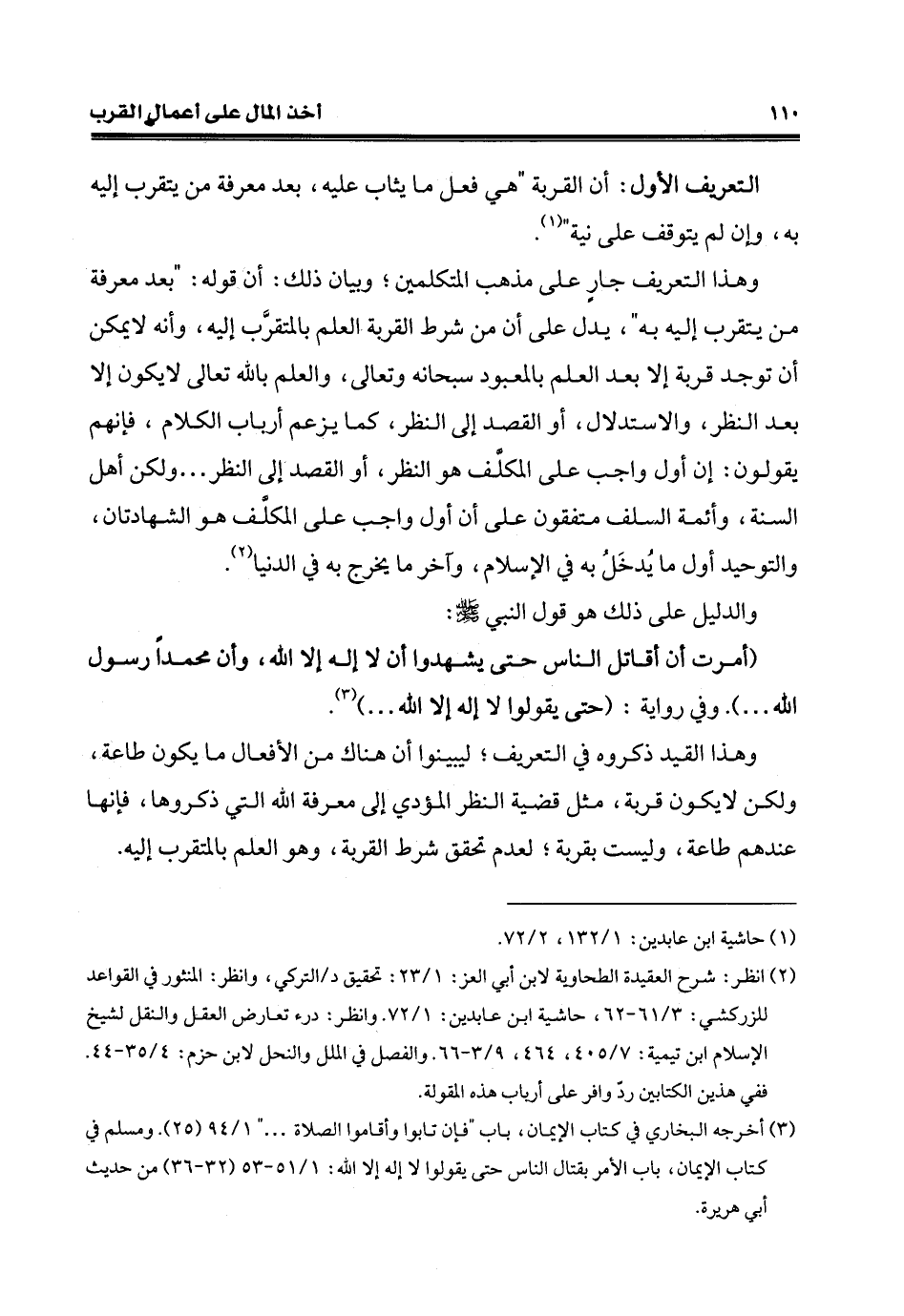 وهذا التعريف جارٍ على مذهب المتكلمين؛ وبيان ذلك: أن قوله: "بعد معرفة من يتقرب إليه به"، يدلُّ على أن من شرط القربة العلم بالمتقرَّب إليه، وأنّه لا يمكن أن توجد قربة إِلَّا بعد العلم بالمعبود سبحانه وتعالى، والعلّم بالله تعالى لا يكون إِلَّا بعد النظر، والاستدلال، أو القصد إلى النظر، كما يزعم أرباب الكلام، فإنهم يقولون: إنَّ أول واجب على المكلَّف هو النظر، أو القصد إلى النظر ... ولكن أهل السُّنَّة، وأئمة السلف متفقون على أن أول واجب على المكلَّف هو الشهادتان، والتوحيد أول ما يُدخَلُ به في الإسلام، وآخر ما يخرج به في الدنيا (¬2).