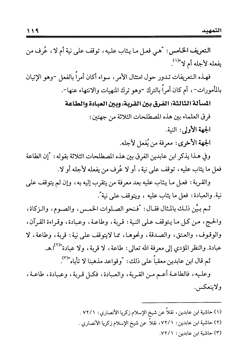 وفي هذا يذكر ابن عابدين الفرق بين هذه المصطلحات الثّلاثة بقوله: "إنَّ الطّاعة فعل ما يثاب عليه، توقف على نيّة، أو لا عُرف من يفعله لأجله أو لا.