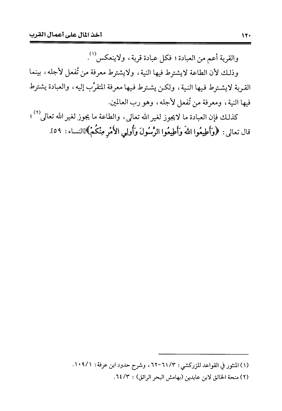كذلك فإن العبادة ما لا يجوز لغير الله تعالى، والطاعة ما يجوز لغير الله تعالى (¬2)؛ قال تعالى: {أَطِيعُوا اللَّهَ وَأَطِيعُوا الرَّسُولَ وَأُولِي الْأَمْرِ مِنْكُمْ} [النِّساء: 59].